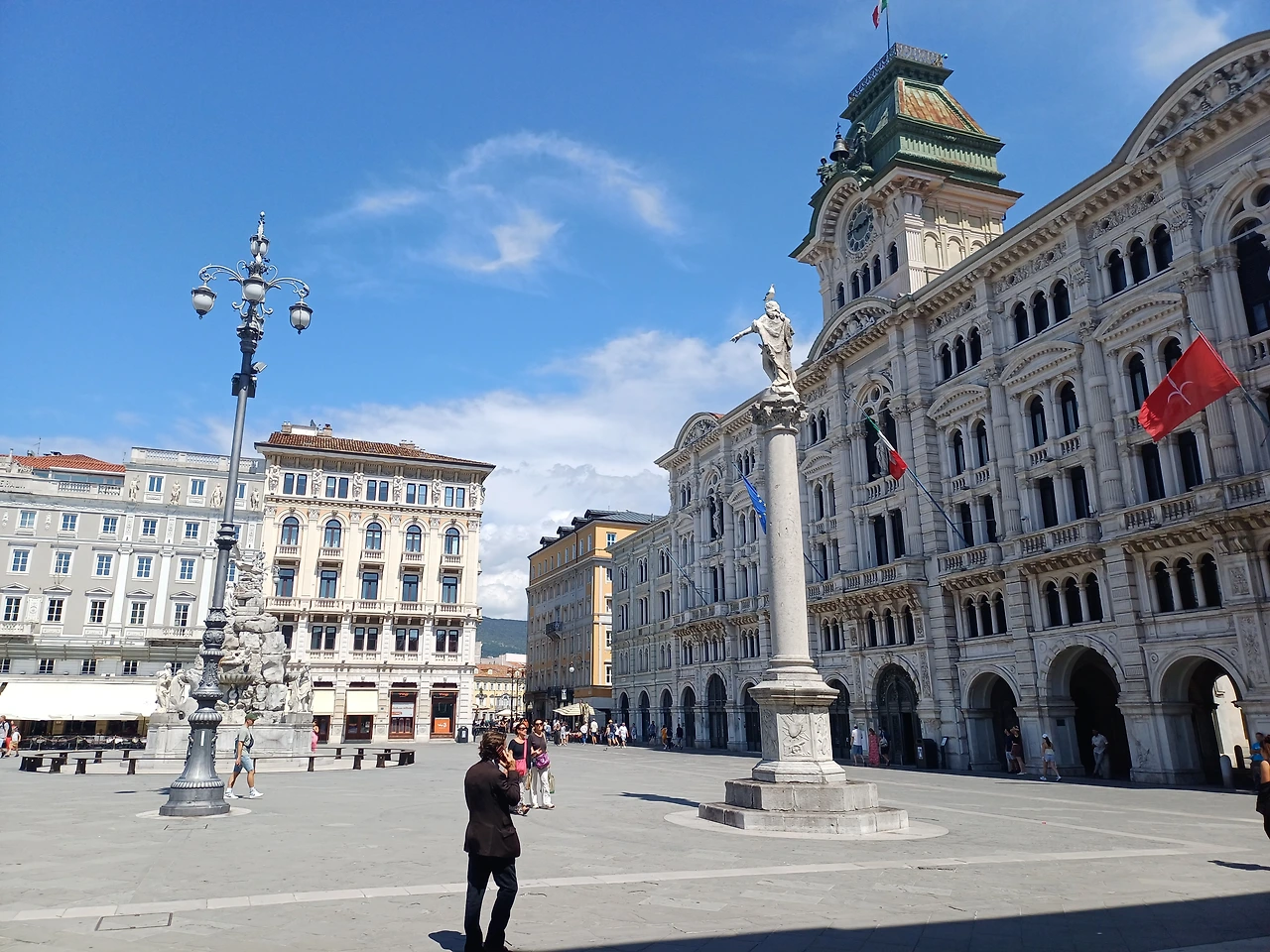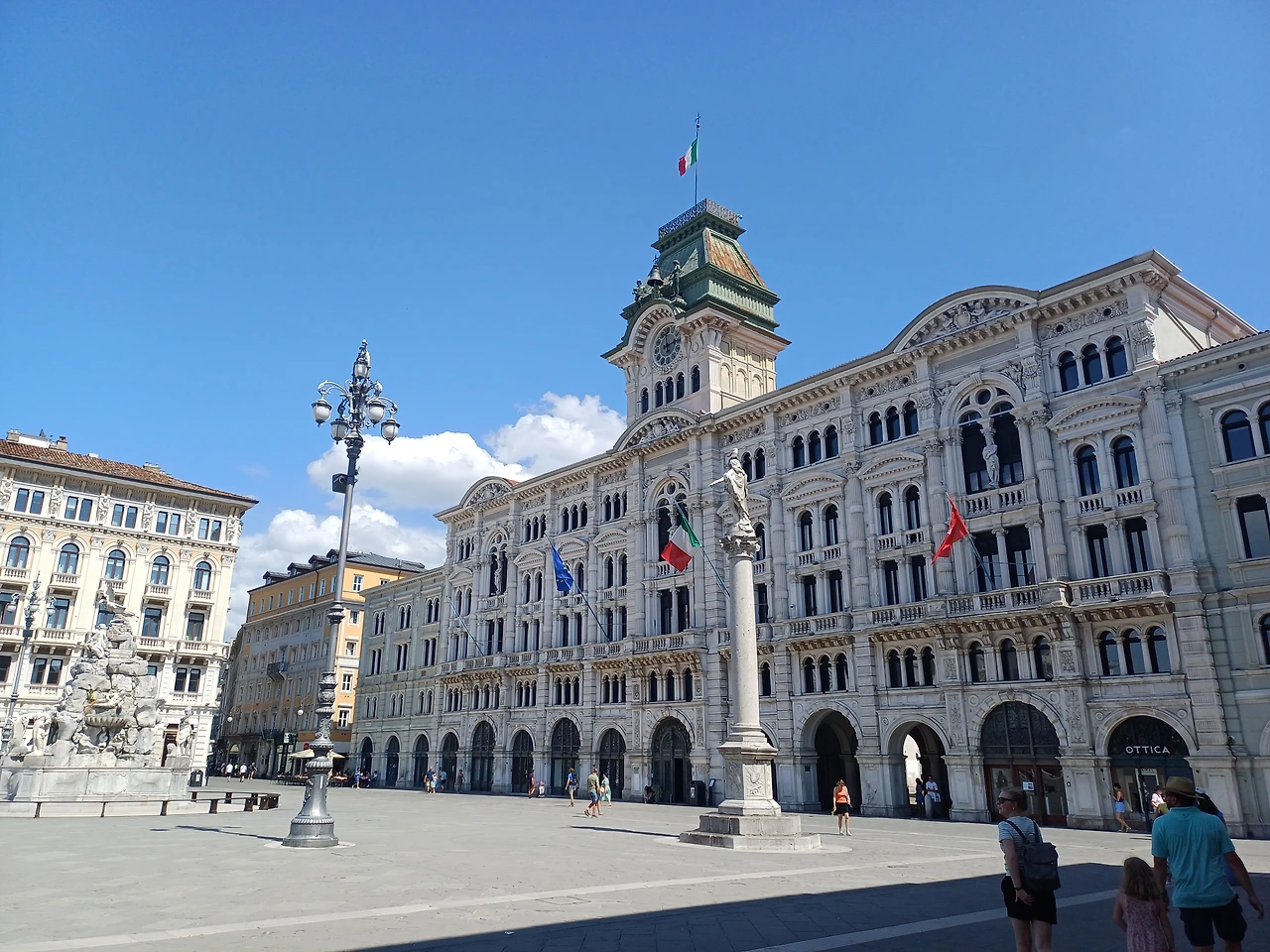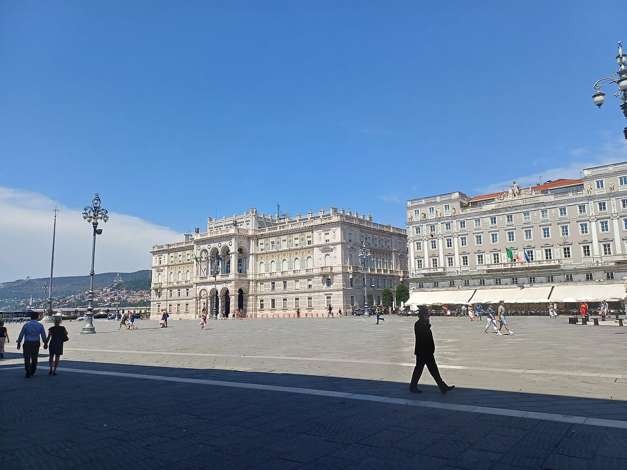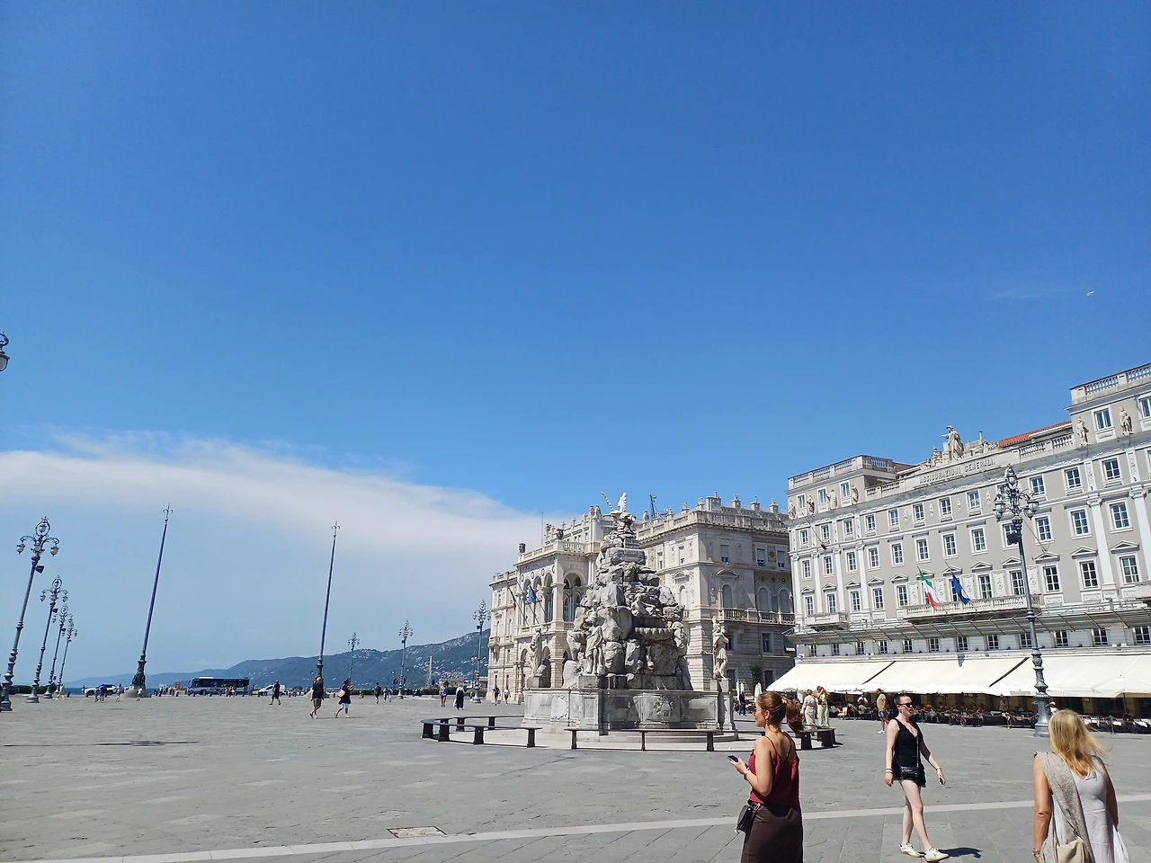 드디어 트리에스테의 주요 관광지 피아짜 우티타디탈리아광장에 도달했다. 피아짜 우티타디탈리아(Piazza Unita d'Italia)는 이탈리아 통합광장이라는 뜻으로 이탈리아로 통합되기 이전인 오스트리아-합스부르크 시절에는 오스트리아 황제였던 프란츠 요제프 1세의 이름을 따서 만든 피아짜 프란체스코-쥬세페로 불렸다.트리에스테가 이탈리아에 합병이 되면서 그것을 기리기 위해 우니타 디탈리아 (Unity of Italy) 광장이 되었다. 이탈리아에서 바다가 보이는 유일한 광장이라는데, 청명한 하늘과 바다가 맞닿아 더할 수 없이 아름다웠다.