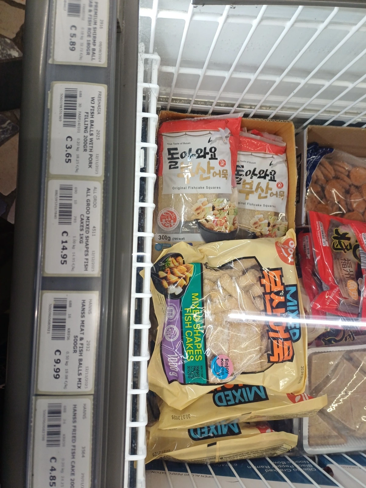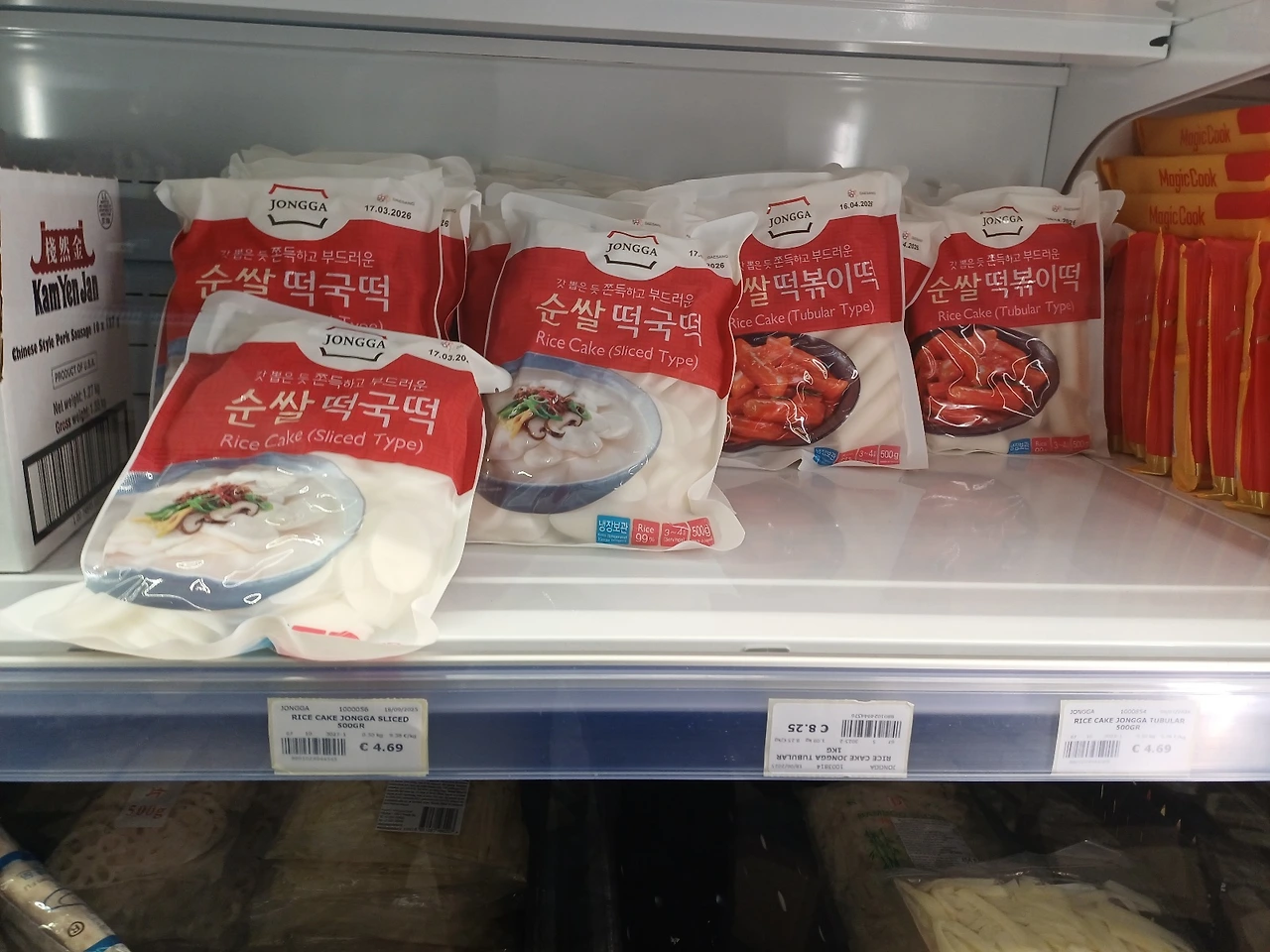 쌀떡도 보이는데요, 예전에는 서양인들이 떡의 쫄깃쫄깃한 식감을 싫어했지만 어느샌가부터 떡볶이는 아주 인기 있는 음식이 되었습니다. 저도 아들의 학교에 가서 떡볶이 만드는 법을 학부형들에게 가르쳐 주었는데, 저에게 직접 만든 떡볶이 사진을 보내주기도 했습니다. 이제는 떡의 식감도 거부감 없이 받아들이는 유럽인들이 되었습니다. 그 덕분에 떡 가격이 최근 많이 올랐다는 것은 좀 아쉽습니다. 500그램이 4.7유로로 약 8000원입니다.