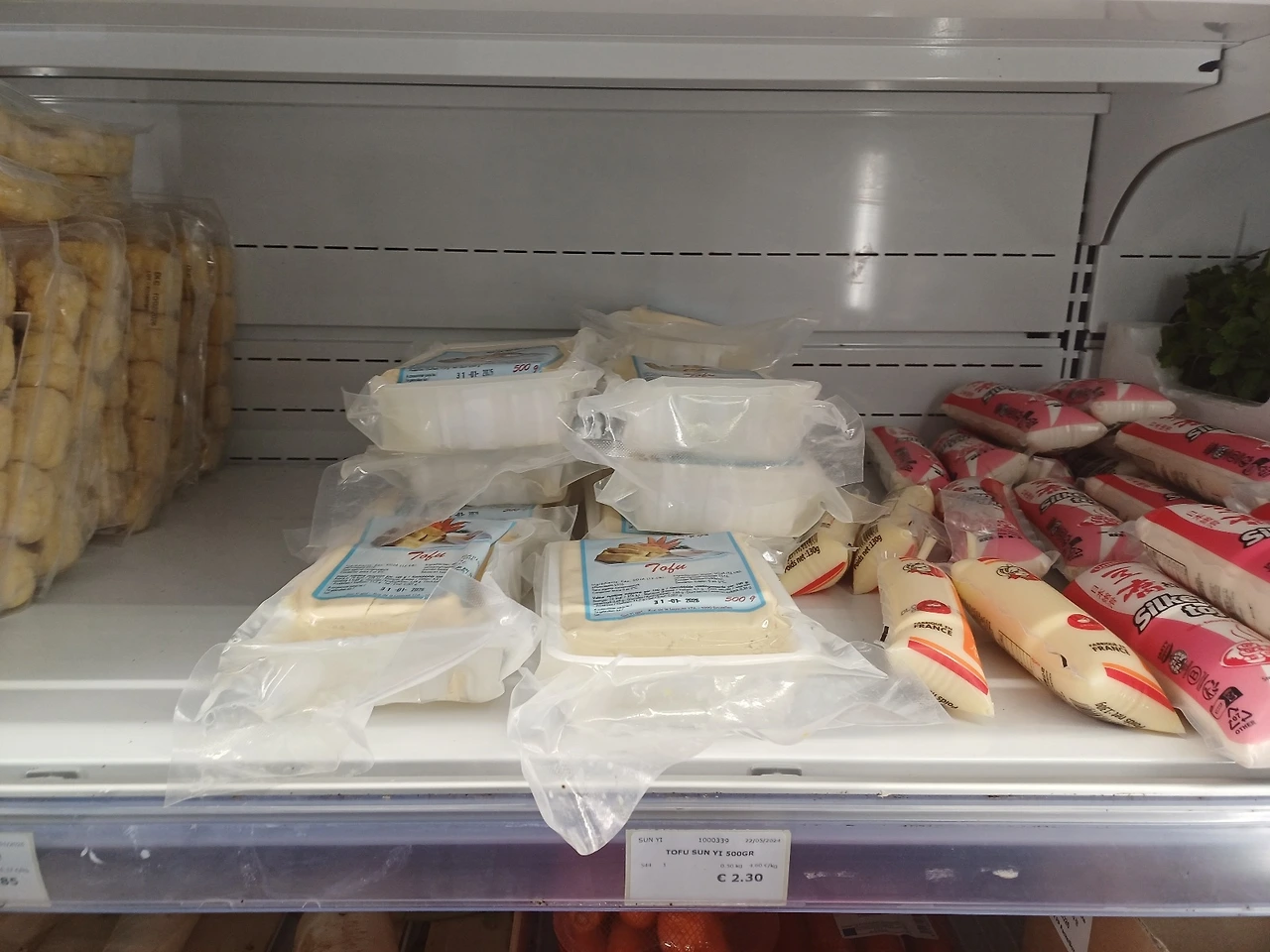 삼각김밥이 보입니다. 저는 절대 삼각김밥을 사지 않는데, 그 이유는 아주 간단합니다. 밥만 있으면 아무나 다 만드는 삼각김밥의 가격이 4유로, 6800원 정도 이기 때문입니다. 저희 집에는 삼각 김밥 틀이 있는데 제가 직접 아이들에게 만들어 줍니다. 저 돈이면 삼각김밥을 한 6개는 만들 것 같은데 너무 비쌉니다. 그리고 팽이버섯, 순두부와 모두부도 보입니다. 한국 두부도 자주 판매를 하는데 오늘은 매진이 된 것인지 보이지 않네요.