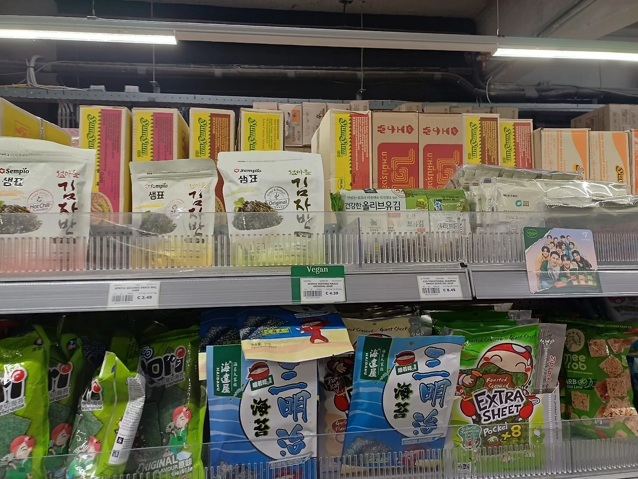 그리고 김자반과 김도 있고요. 김의 수출액이 사상최고치를 달성했다는 뉴스를 읽었습니다. 수출이 되어 이곳 8700킬로 떨어진 벨기에 동네 상점의 매대에 올라와 있습니다. 이곳에서 김은 밥을 먹기 위한 반찬이라기보다는 건강한 스낵으로 자리매김을 하고 있습니다. 하지만 저는 밥 없이 김만 먹는 사람들을 보면 안타깝습니다. 흰 밥에 싸 먹는 김맛을 모르다니, 마음이 아픕니다. 사실 김 가격이 많이 오른 이유는 수출로 인한 것이기도 합니다. 김자반 50그램짜리가 대략 7000원입니다.
