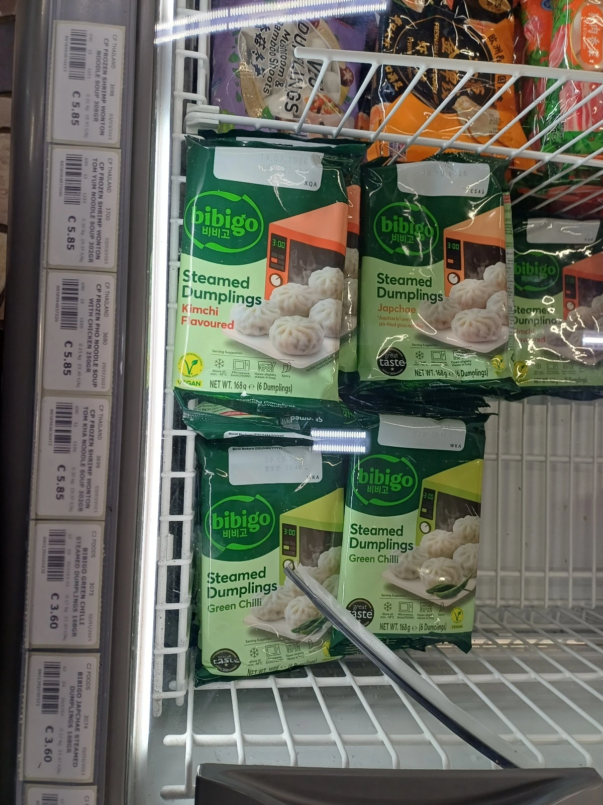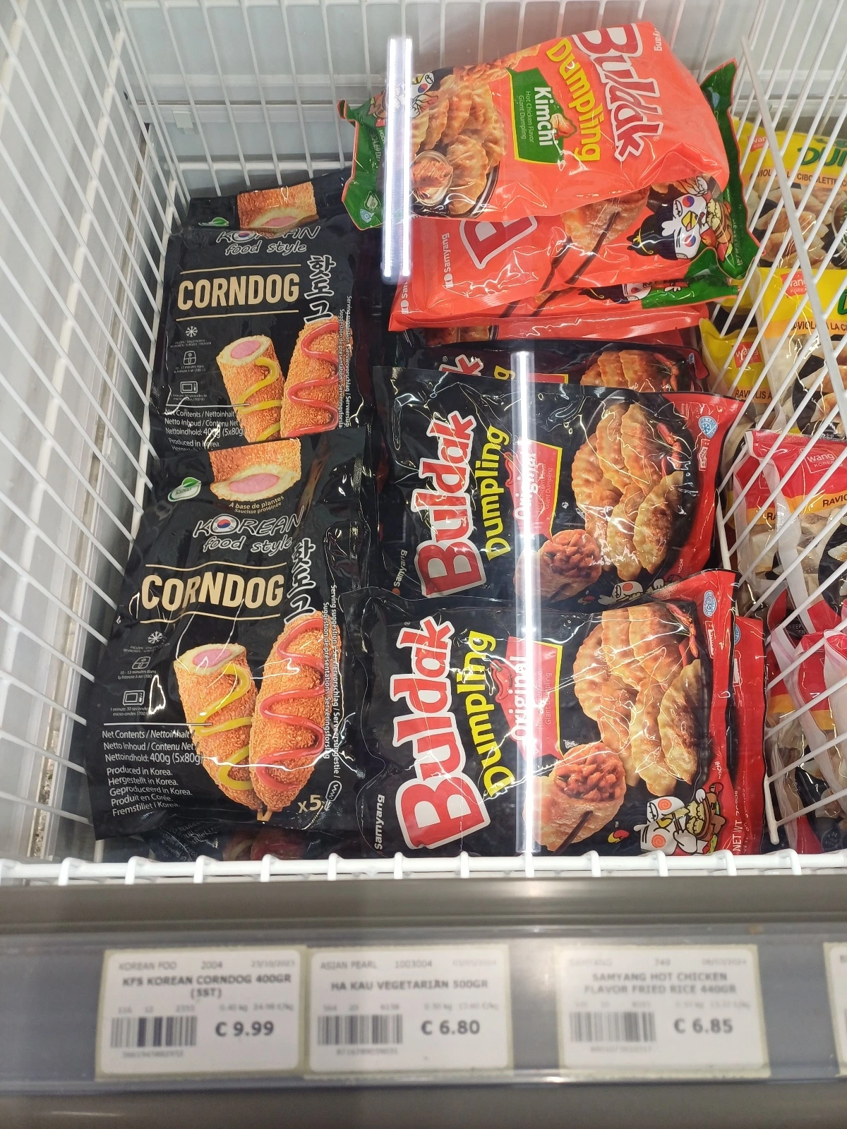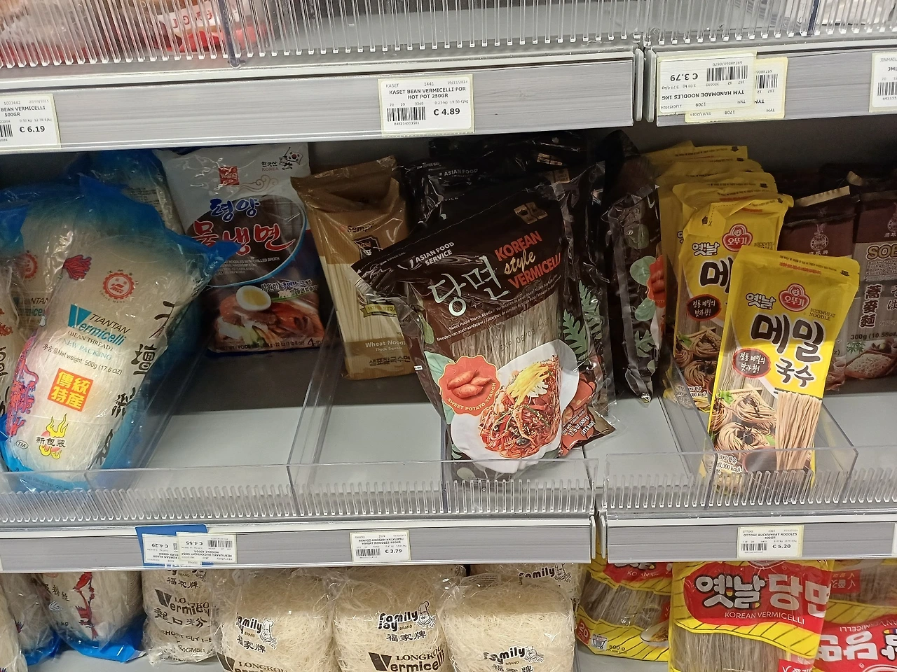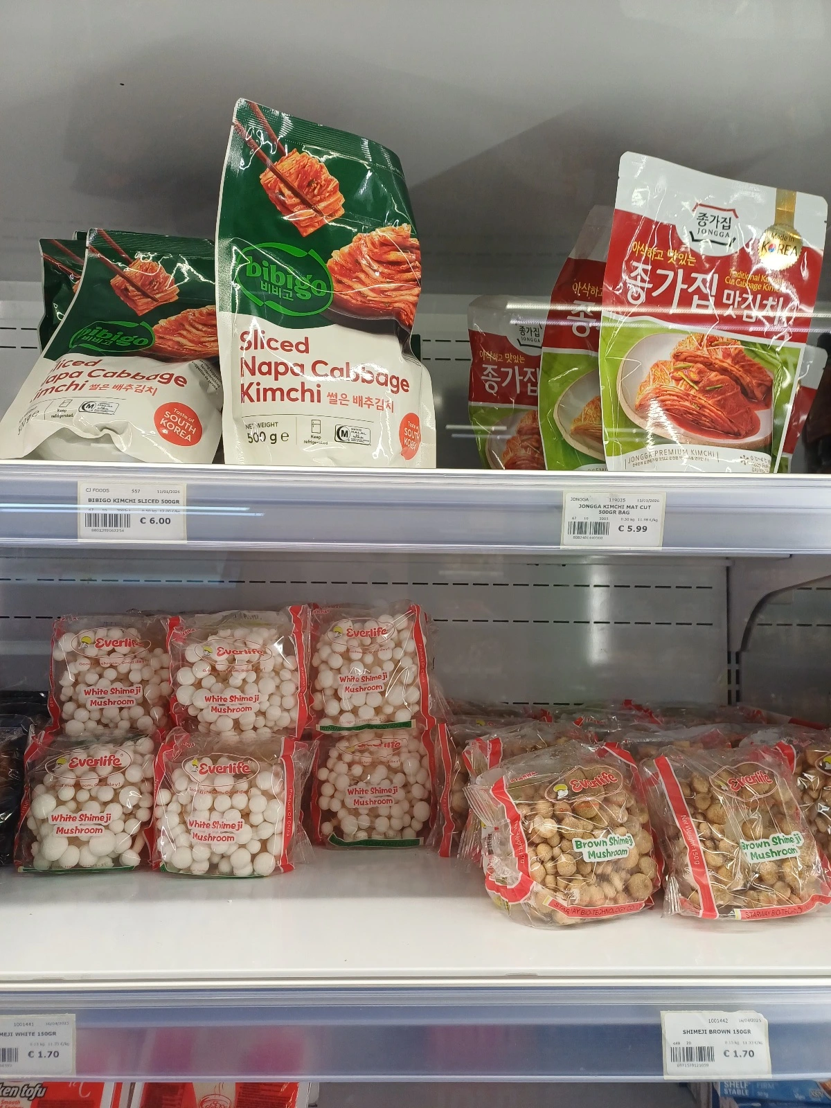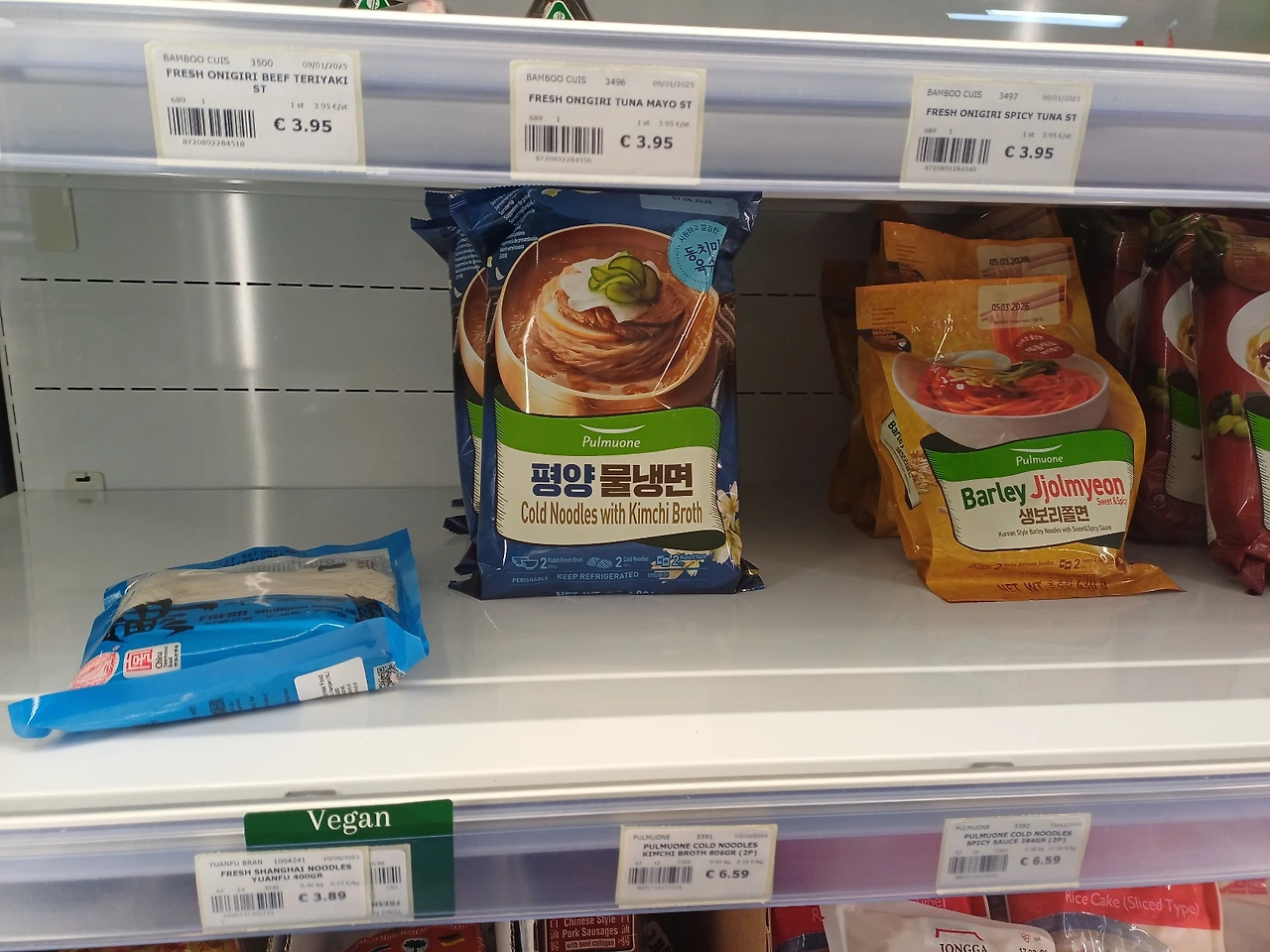 안으로 들어서면 냉장코너가 나오는데, 저의 눈을 사로잡는 것은 김치와 팽이버섯, 그리고 물냉면과 쫄면입니다. 김치의 가격은 500그램 기준 종갓집김치와 비비고 둘 다, 6유로(10000 원가량)입니다. 물냉면과 쫄면은 각각 2개입으로 11000원 정도입니다. 싸지는 않지만 지구 반대편의 낯선 나라에서 물냉면과 쫄면을 먹을 수 있다는 것이 감격스럽습니다.