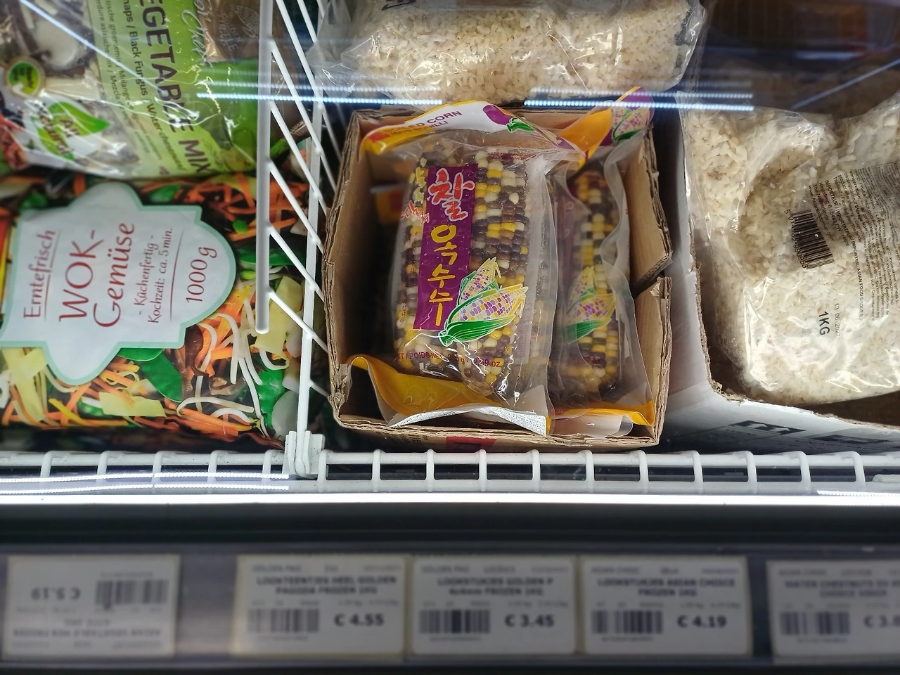이제 냉동코너로 가 보겠습니다. 냉동코너에도 한국 식품들이 가득합니다. 찰옥수수가 보입니다. 반갑지만 가격은 안 반갑습니다. 3.45유로 5000원 정도 합니다.