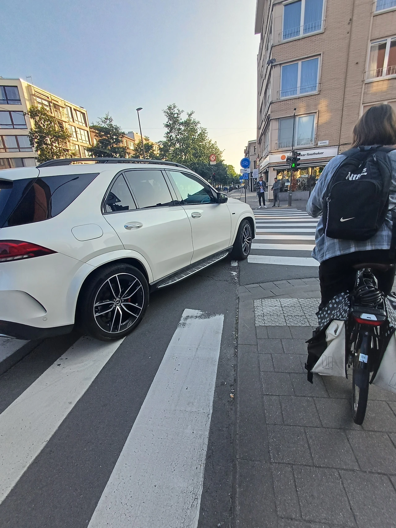 사고는 바로 이곳에서 벌어졌다. 자전거 도로에서 신호가 빨간불이어서 기다리다 초록불로 바뀌어 출발했다. 저 사진에 보이는 흰색 벤츠차량이 우회전을 했다. 나를 봤을 줄 알았다. 당연히 자전거도로에서 직진을 하는 사람이 우선이기에 멈출 줄 알았다. 그것은 나의 판단미스였다.