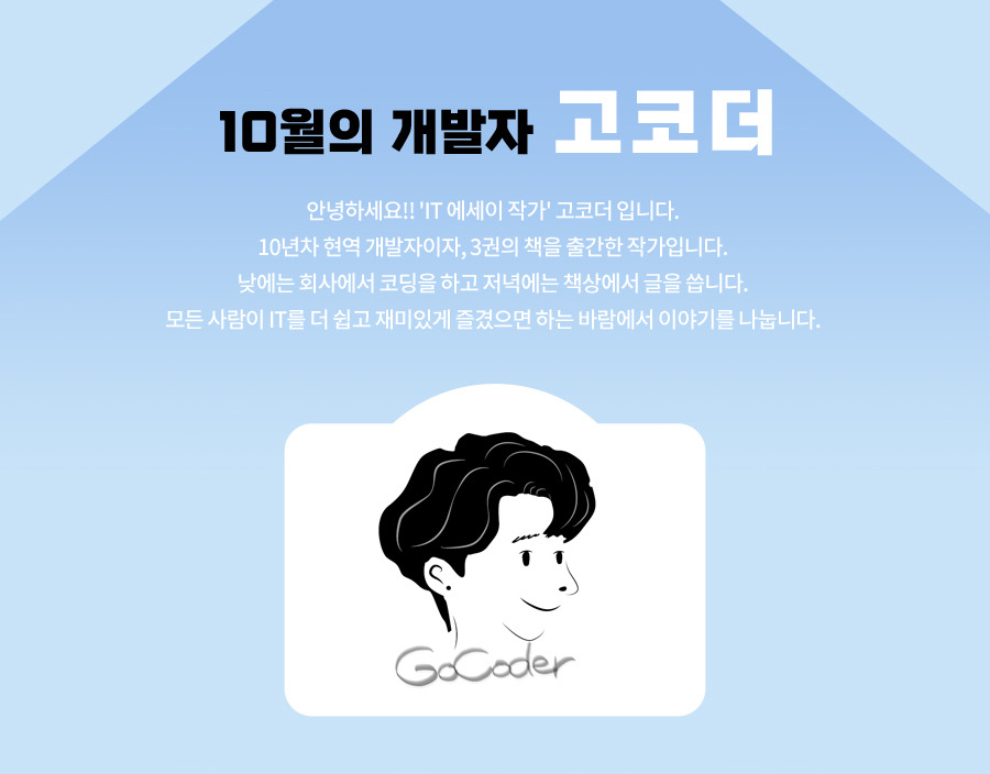 IT 에세이 작가, 현업 개발자, 코딩 강사, 강연자, 파워블로거 | 출판, 강연, 방송, 인터뷰등 제안 연락주세요. "gocoder@kakao.com"