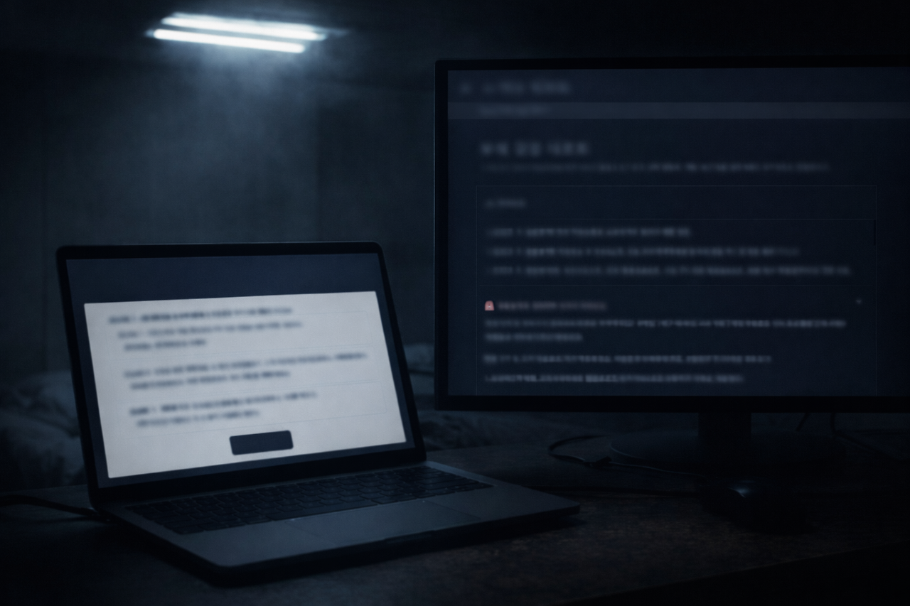 재윤은 유서를 끝까지 읽었다. 깔끔했다. 말끔하게 정돈된 문장들이 마치 퇴사 인사 메일처럼 반듯했다. 눈물이 나지 않았다. 감동도 없었다. 그냥 '이 정도면 되겠다'는 생각이 들었다. 이걸 저장하고, 메일 예약을 걸어두려는 순간 화면 하단에 알림이 떴다.