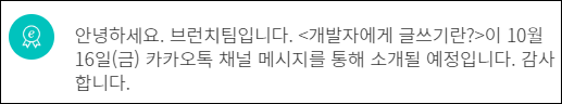 안녕하세요. 브런치팀입니다. <개발자에게 글쓰기란?>이 10월 16일(금) 카카오톡 채널 메시지를 통해 소개될 예정입니다. 감사합니다.