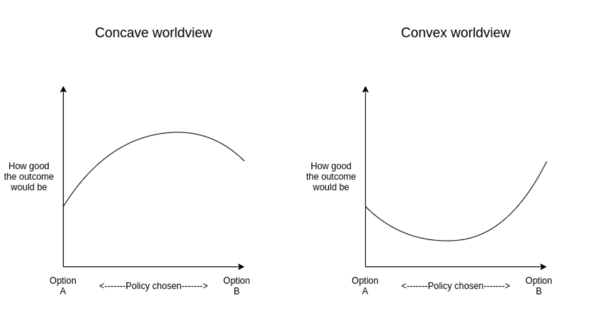 Concave(오목한)는 타협이 가능한 의사 결정을, Convex(볼록한)는 동전 뒤집기로 둘 중 하나의 제안만 선택해야 하는 의사 결정을 의미한다. 비탈릭 부테린은 "이더리움 생태계는 Concave, 비트코인 생태계는 Convex 하다"라고 평가한 바 있다. 부테린은 비트코인 생태계는 탈중앙화인지 아니면 중앙화인지 양 극단밖에 없다고 본 것이다.
