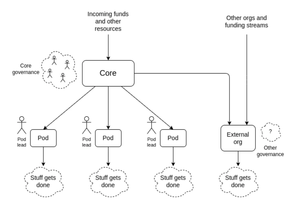 우크라이나 다오는 상위에 '핵심(Core)'를, 하위에 실무 그룹인 '팟(Pods)'을 둔다. 팟에 기능을 분산시킨 것이다. 거버넌스 코어가 팟을 생성할 수는 있지만, 한 번 생성된 팟은 자체 리더를 두고 다소 중앙화된 방식으로 작동한다.