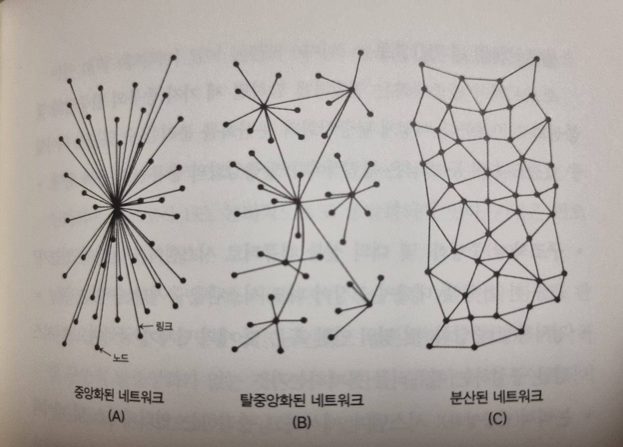 비탈릭 부테린의 중앙화, 탈중앙화, 분산 개념 시각화.