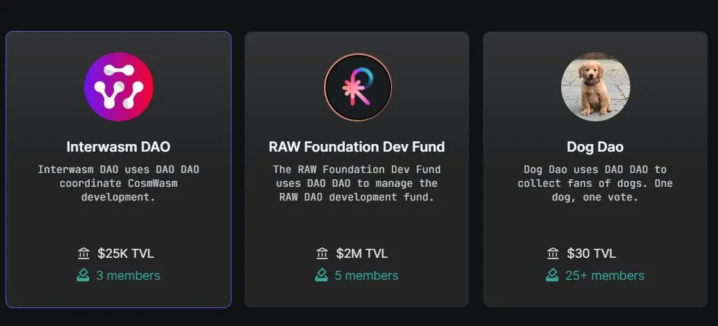 시바 견 밈(소셜미디어에서 유행하는 이미지나 영상)을 활용해 도지코인(DOGE)이 만들어진 것처럼, DAO DAO를 통해 '강아지 DAO'처럼 단순히 재미를 위한 DAO도 조직할 수 있다. 물론 디파이 활동을 위한 DAO도 제작 가능하다. 다만, DAO DAO를 통해 만들어진 DAO는 코스모스 생태계의 다른 프로젝트들하고만 호환될 수 있다.