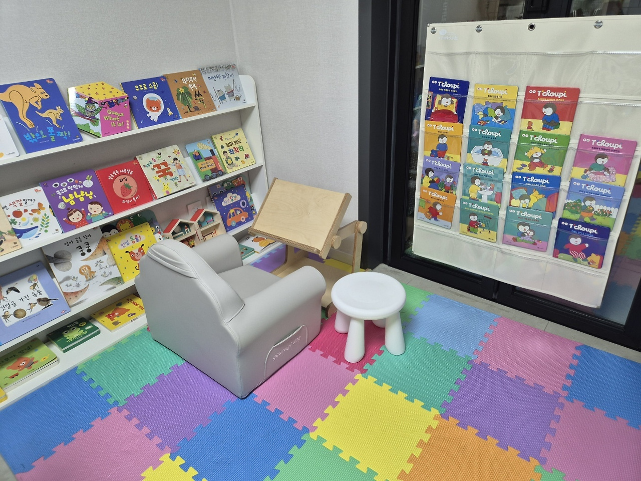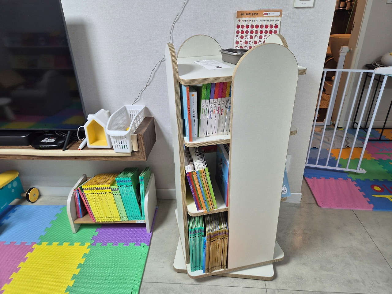 특히 거실에 코코지, 전면책장, 회전책장, 1단 책장을 적재적소에 두어 거실을 아이의 언어 발달을 돕는 장소로 변모시켰다. 실제로 아이는 요즘 밥 먹을 때마다 코코지 노래를 듣고 밥 먹고 쉬고 싶을 때는 소파에 앉아 전면 책장에서 꺼낸 책을 독서대에 놓고 읽는다. 강아지 사진을 보고 싶을 때는 TV장 아래의 1단 책장에서 동물 책을 꺼내오고 회전책장을 재미로 빙글빙글 돌리다가도 관심 가는 수학 책을 꺼내서 읽기도 한다.