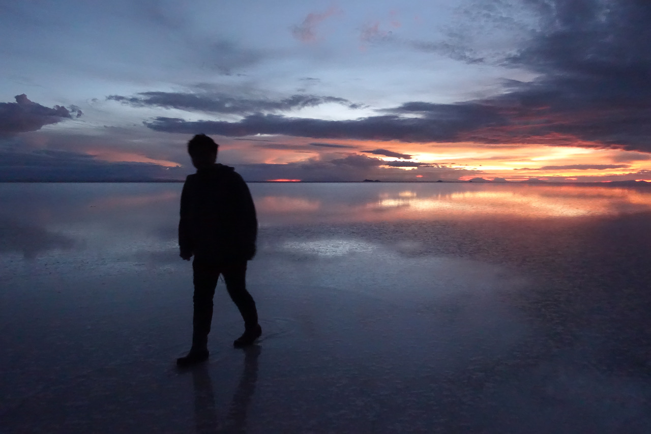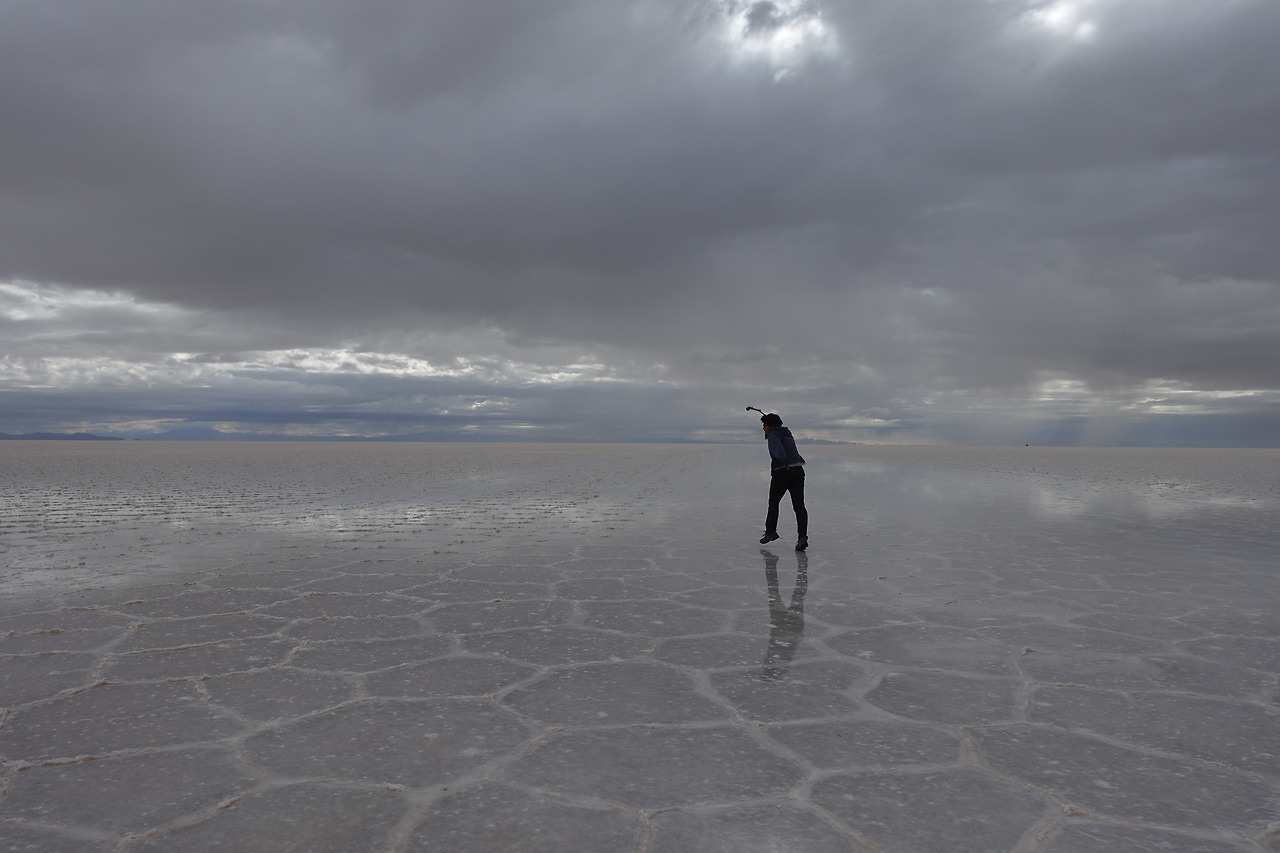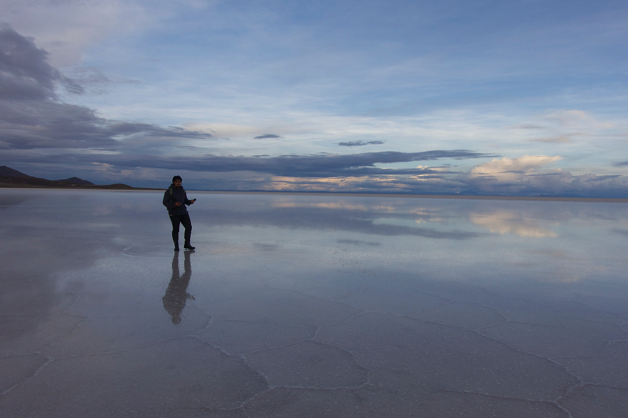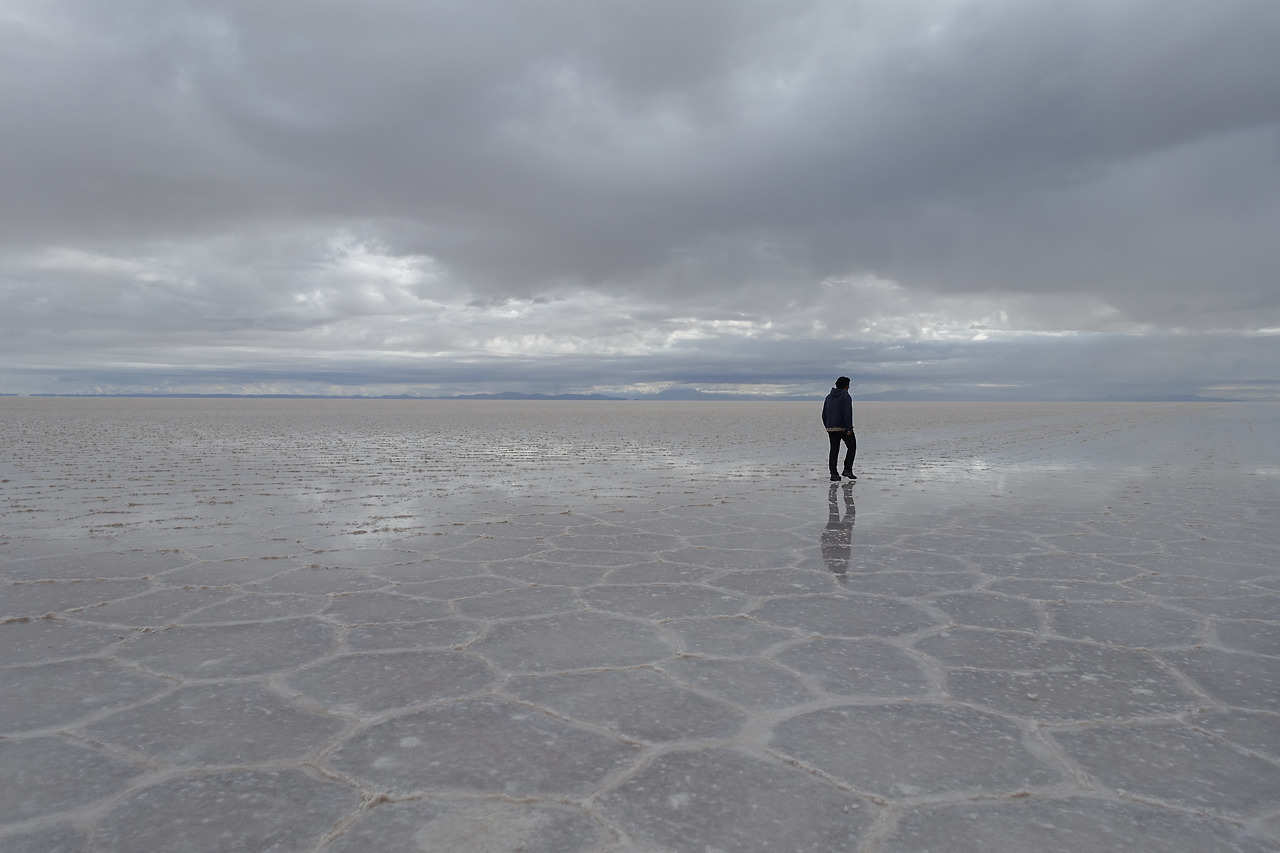 고산증 때문인 건지 모르겠지만, 이상하게도 물이 찬 우유니가 감탄스러울 정도로 좋진 않았다. 그냥 좀 허무했다. 사진을 한참 찍다가 소변이 마려웠다. 소금사막에 화장실이 어디 있겠나. 다른 여행객들이 없는 곳으로 멀리 걸어가서 방뇨했다. 육각형 블록 모양 바닥에 대고 쉬이이이이. 뜨뜻한, 한 때는 내 것이었던 소변을 방류하니 등골이 싸늘해졌다.