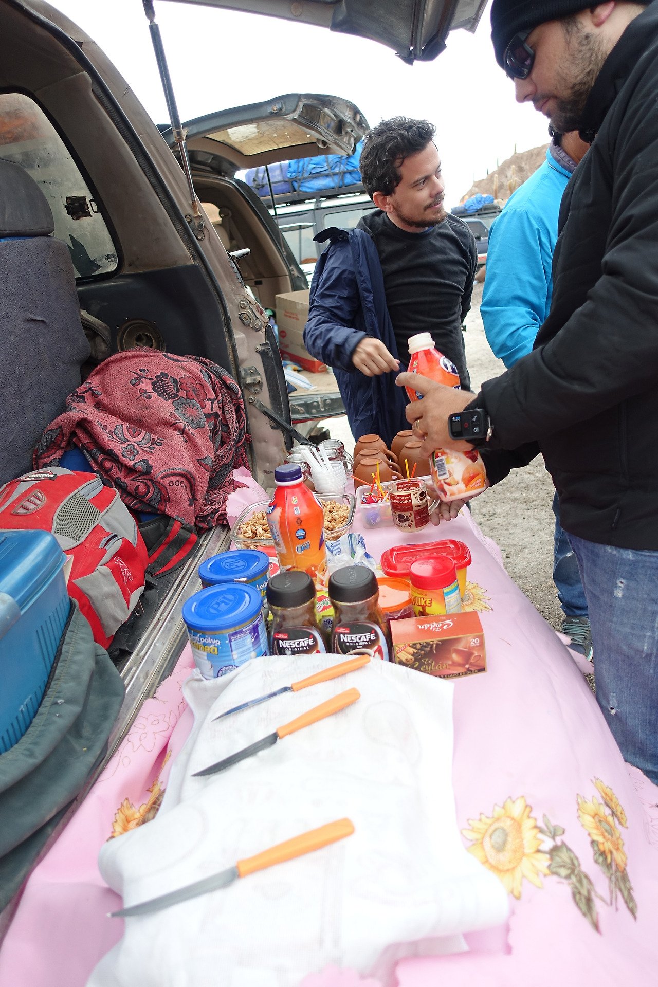 차 트렁크를 열고 다 함께 아침식사를 준비하는 중