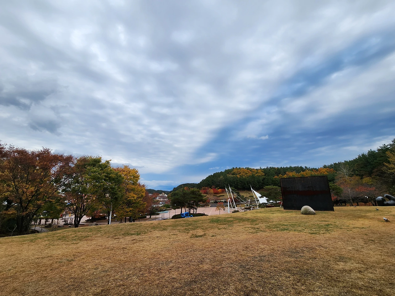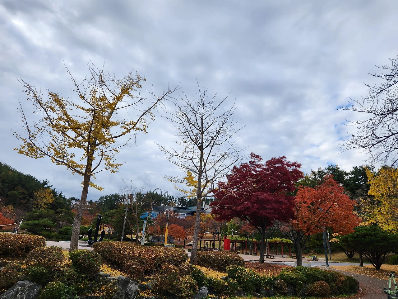 오랜만의 나들이어서, 오늘은 공원 안팎의 경계(境界)를 잇는 둘레길을 먼저 걸어보기로 했다. 공원 안 포항시립 미술관 쪽으로 발걸음을 돌리는데, 새벽녘에 한차례 비가 내려서인지 공원으로 산책하러 나온 사람들이 생각보다 많지는 않았다. 날이 차가워질 것으로 예보(豫報)되어 넥 워머까지 단단히 목에 둘렀으나, 경사진 길을 따라 오르려는데 벌써 몸안이 훈훈했다. 잔기침이 잇따라 몸이 약간 불편해졌으나, 양손을 뒤로 젖혀 크게 심호흡을 하고나니 이내 기침이 잦아들었다. 포항시립 미술관 조각 공원을 돌아보고 둘레길의 내리막을 걷고 있는데, 주변 조경수(造景樹)의 단풍이 절정(絶頂)을 이루고 있었다. 잃어버린 시간을 보상(補償) 받는 심정으로 이를 배경 삼아 열심히 셀카를 찍고 있자니 슬쩍 옆으로 중년의 여성 셋이 다가선다. 이들이 보기에도 단풍이 무척 고와 보였던 것이다. 약간은 무안했던지, 옆으로 비켜서 있는 나를 보고 잠시 깔깔대더니만 서로 머리를 한 곳으로 모으고 셀카를 찍었다.