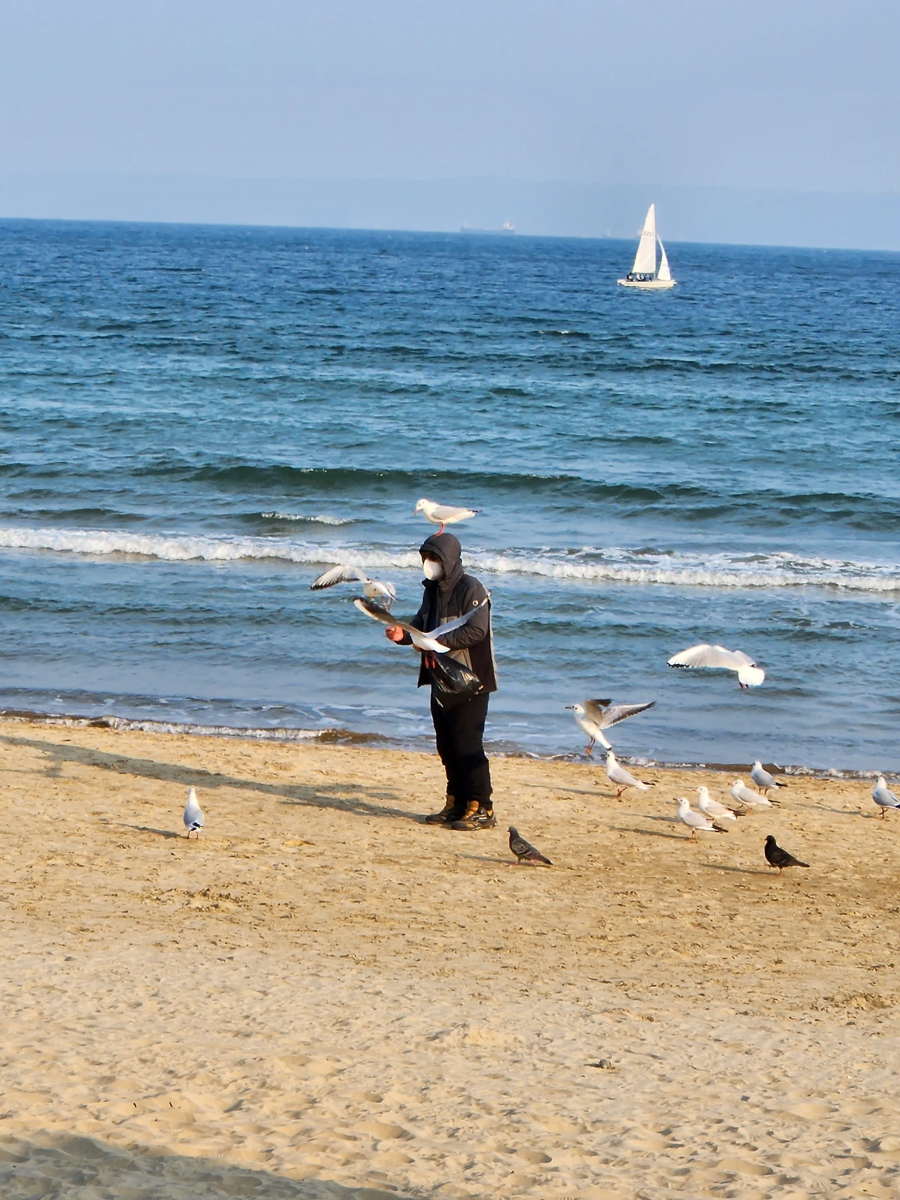 집사람과 막내를 집으로 먼저 보내고 나서, 바닷가 산책로로 이어지는 횡단보도를 막 건너고있는데 하늘에서 빗방울이 한두 방울씩 떨어지기 시작했다. 일기예보 상으로는 동해안 쪽으로 종일 흐리기는 해도 비는 오지 않는다 했기에, 내킨 김에 등대가 있는 방파제까지 마저 걸어가기로 마음을 굳혔다. 백사장으로 이어지는 데크길에는 잔뜩 흐린 바닷가를 배경으로 셀카를 찍는 사람들이 드문드문 보였다. 마침, 길옆에는 갈매기에게 먹이를 주려던 참인지 새우깡 봉지를 막 뜯고 있는 사내가 있었다. 이 사람의 발치에는 미리 온 갈매기 두 마리가 먹이를 기다리며 고개를 주억거리고 있는데, 어느 틈엔가 바다 가까운 백사장 저편에서 갈매기 네댓 마리가 양 날개를 펴고 비행기가 활주로에 안착하듯 세찬 바람에 편승(便乘)해 사뿐히 내려앉는다. 이것을 시발점(始發點)으로, 도로변 가로등이나 상가 건물 여기저기에 한가롭게 앉아 있던 갈매기들이 여러 마리씩 떼를 지어 사내 주변으로 내려앉는 모습이 멀리서 보아도 정말 볼만했다. 도대체 어떤 신호나 소리에 공조(共助)해서 이토록 일사불란하게 먹이가 있는 쪽으로 움직이는지 무척 궁금했지만 어쩌면 우리가 알지 못하는 그들만의 생존본능이 따로 있을 게 분명했다.