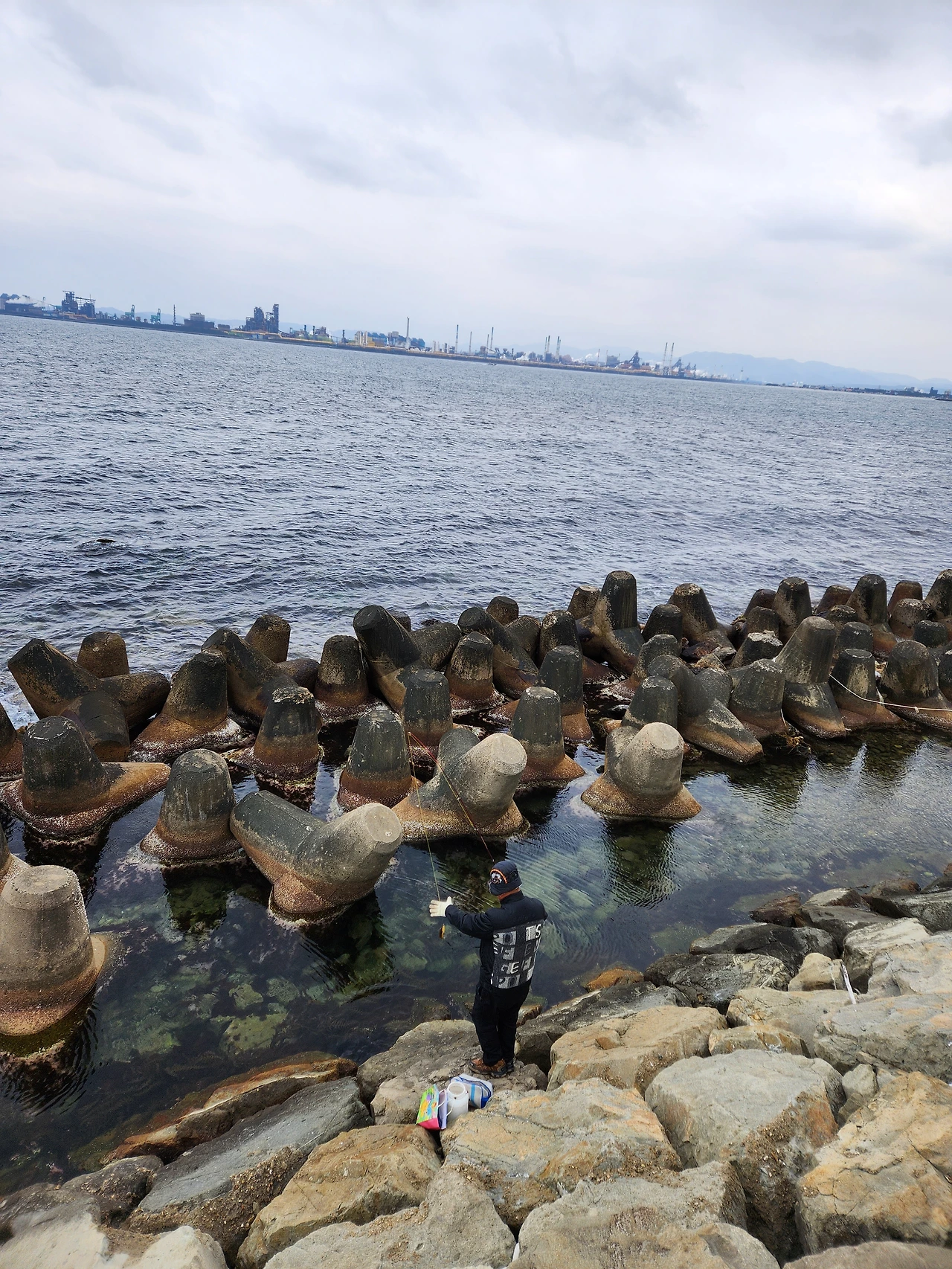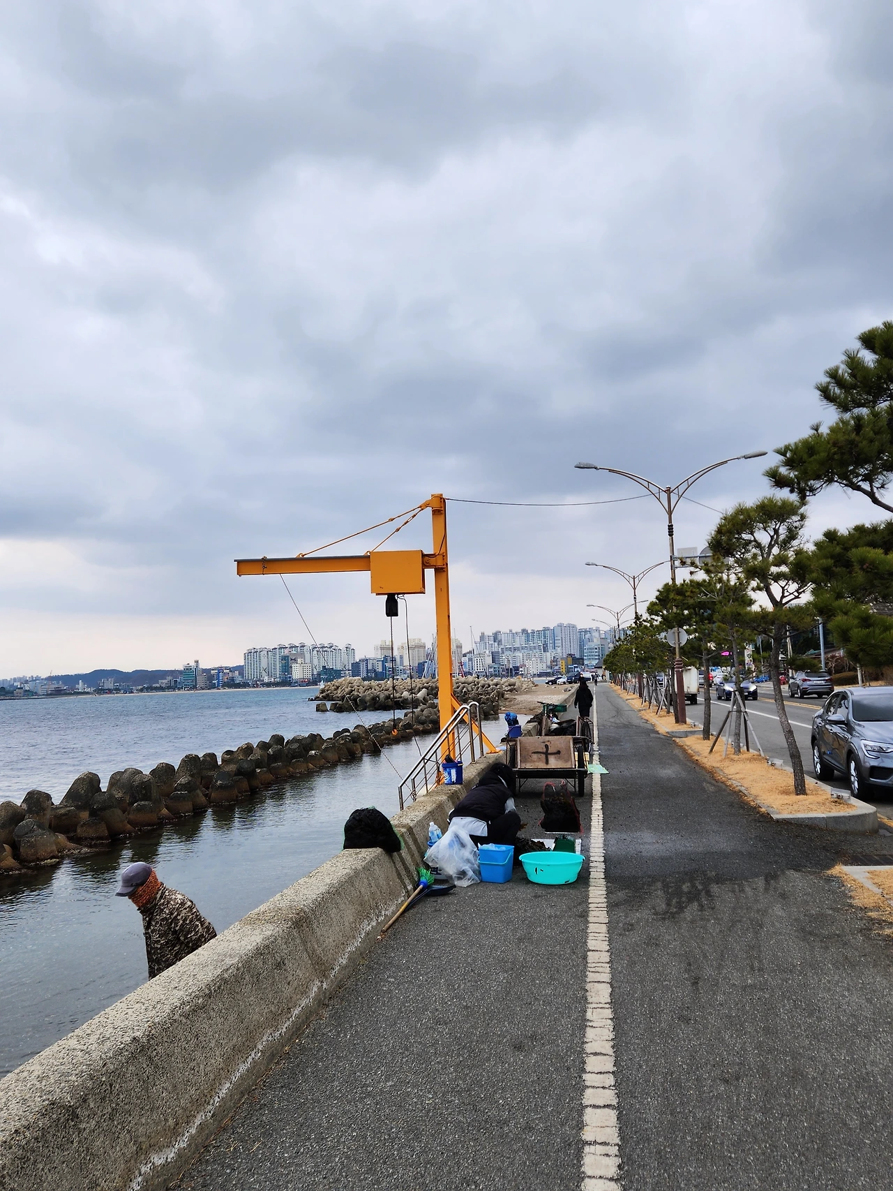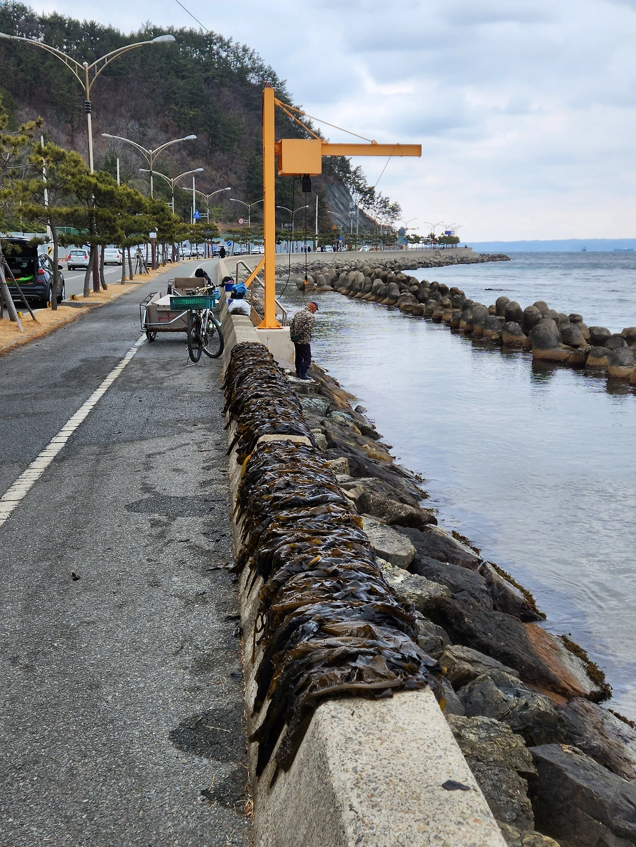 여기서 조금 더 떨어진 곳에는 제방 아래까지 내려가 데트라포트 틈새로 구멍 치기 낚시를 하는 노인이 있었다. 미끼를 끼우고 낚싯대를 들었다 놓았다를 몇 차례 되풀이 하다가 낚싯대를 쥔 손에 입질이 왔던지 잽싸게 위로 낚아채는데 낚싯줄 끝에는 제법 씨알 굵은 노래미 한 마리가 기운차게 바둥거리고 있었다. 노인이 미끼를 솜씨 좋게 다시 끼우고, 방금 노래미를 낚아 올린 자리에다 재차 낚시 바늘을 내렸는데 서너 번의 손질 만에 바로 또 입질이 왔다. 연이어 네댓 마리를 건져 올리는 솜씨를 보면서 넋이 빠져있는데, 입술 아래로 그만 콧물이 줄줄 흘러내렸다. 한참을 걸어서 더워진 몸이 금세 식어버리고 말았던 것이다.