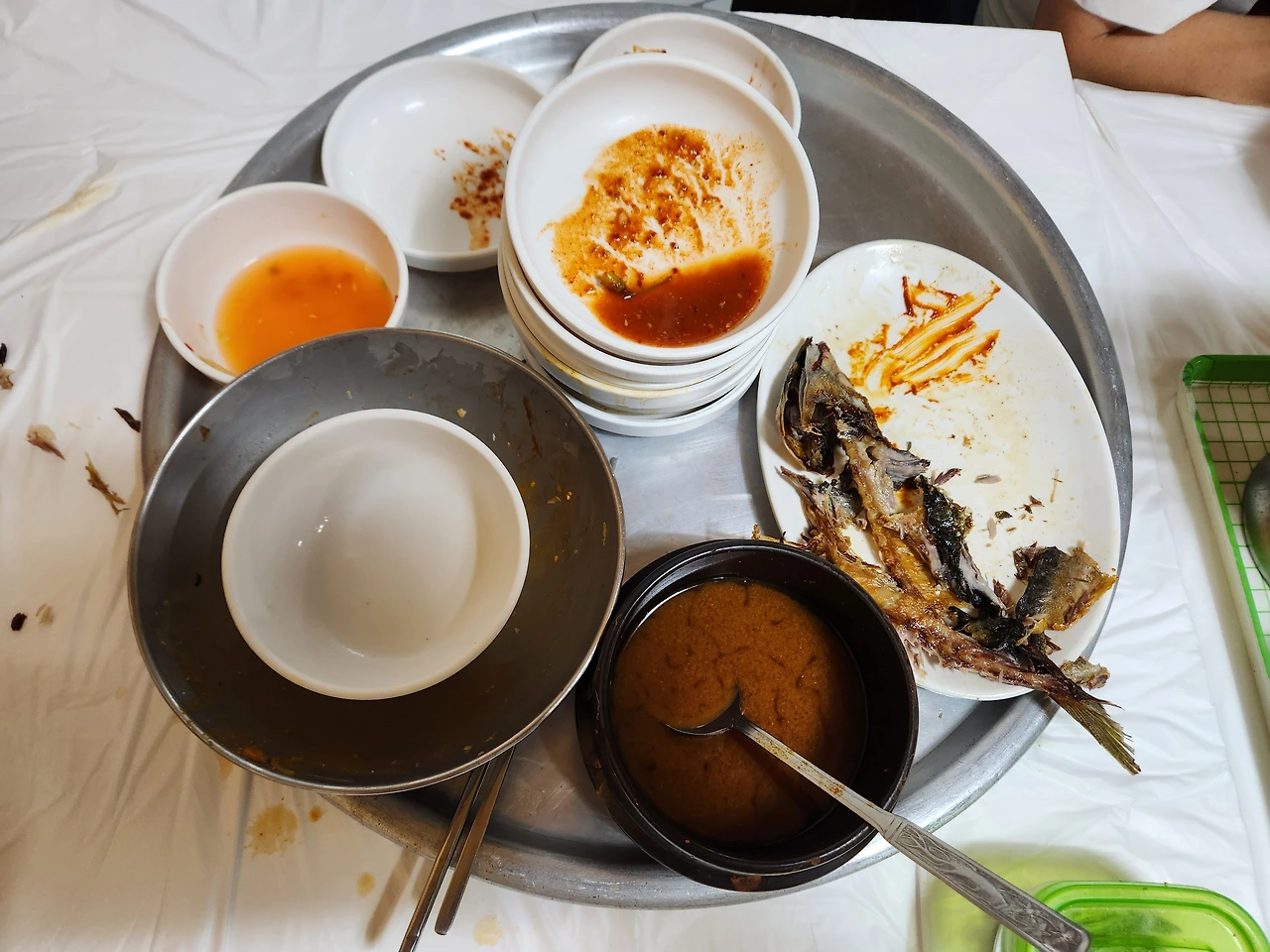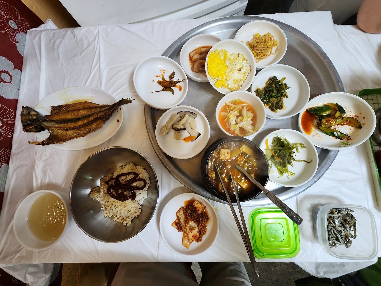 뜻밖에도, 숭늉과 함께 고등어구이가 옆테이블보다 먼저 나왔다. 보리밥과 반찬이 상차림으로 마저 나오길 기다렸다가 함께 사진을 찍을 요량으로 시장기를 꾹꾹 누르고 있는데, 중년부부는 먼저 내어 온 가자미와 고등어구이를 나중에 먹기 좋도록 살점과 뼈를 분리하고 있었다.상차림이 모두 갖추어지고 식사가 시작되면서, 이들 중년부부가 식사 중 조곤조곤 나누는 말에 나도 모르게 귀가 솔깃해졌다.