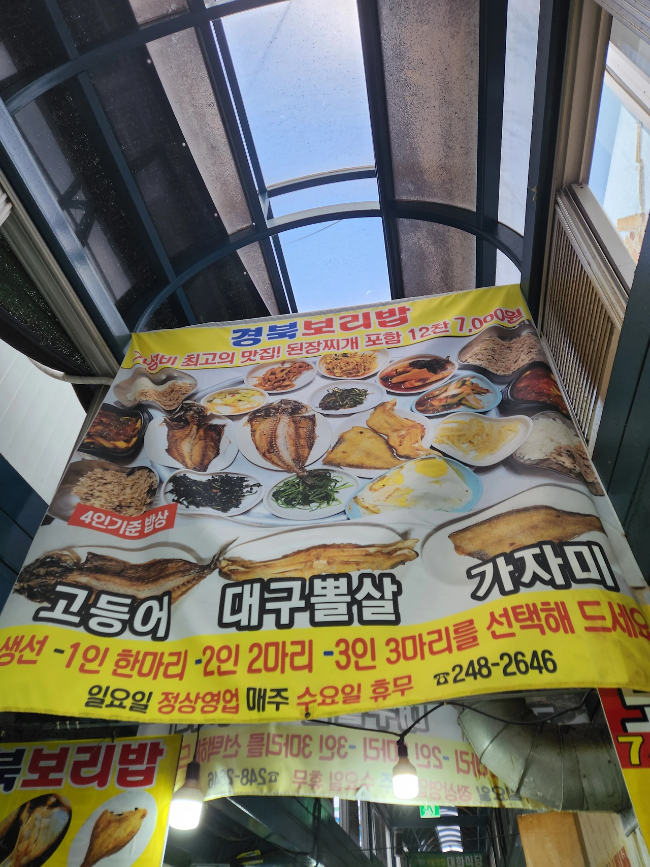 보리밥집은 수제비 골목 맞은편에 있다. 골목을 사이에 두고 '순영네 밥집'과 '대화식당', 그리고 '경북 보리밥'이 서로 마주 보고 있는데, 집집마다 한쪽으로 비켜선 줄이 이미 길게 늘어져 있었다. 상차림은 엇비슷하지만 식당마다 서로 약간의 차이가 있어서 이곳을 찾는 사람들은 식성이나 취향에 따라 단골집이 달라진다. 그런데, 오늘은 다른 두 집에 비해 '경북 보리밥' 앞에는 줄을 선 사람들이 그리 많아 보이지 않았다. 식당 안으로 막 들어서고 있는 사람들 뒤로, 젊은 연인 한 팀과 애 둘을 데리고 온 앳된 엄마, 그리고 중년부부가 전부였다. 줄이 조금씩 줄어들면서, 고등어와 가자미, 대구뽈을 번갈아 기름에 튀기는 일이 분주해질수록 구수한 생선냄새가 코끝을 간질였다.