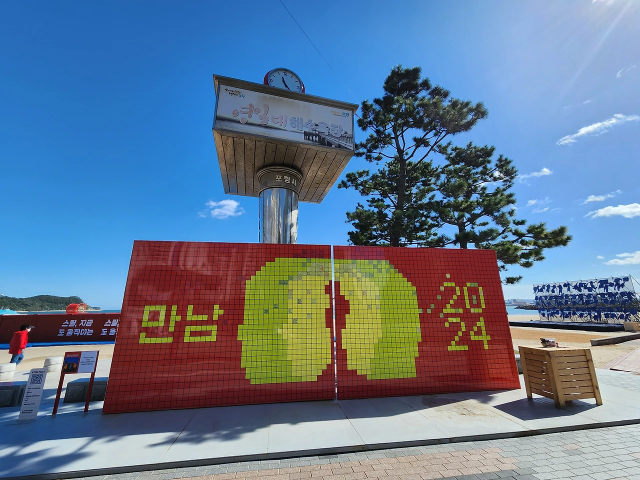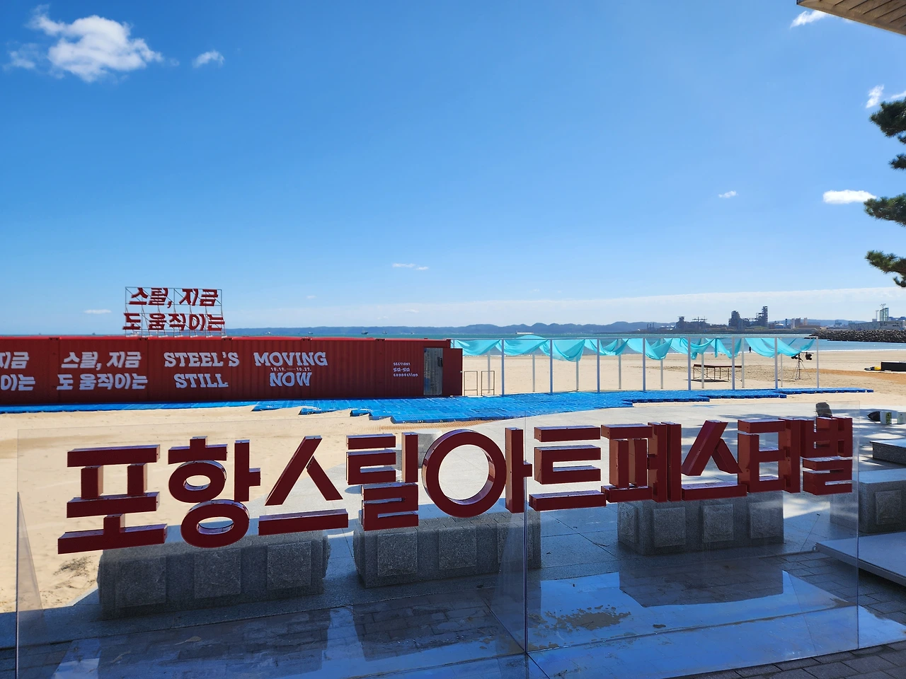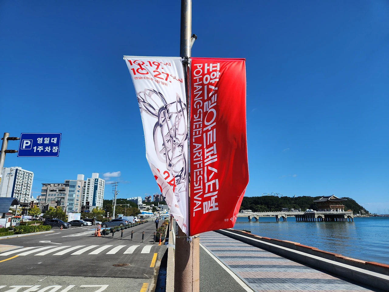 며칠간 비바람이 심하더니 오늘은 모처럼 만에 하늘이 말갛게 맑았다. 온 여름내 적조(赤潮)에 시달렸던 바닷물도 가까운 바다부터 옥빛으로 보이는 것이 물색이 아주 고왔다. 해마다 영일대에서 열리는 포항스틸아트페스티벌의 배너가 가로등마다 걸려 있었는데 잔잔한 바람에도 나 보란 듯 이리저리 나풀거렸다.