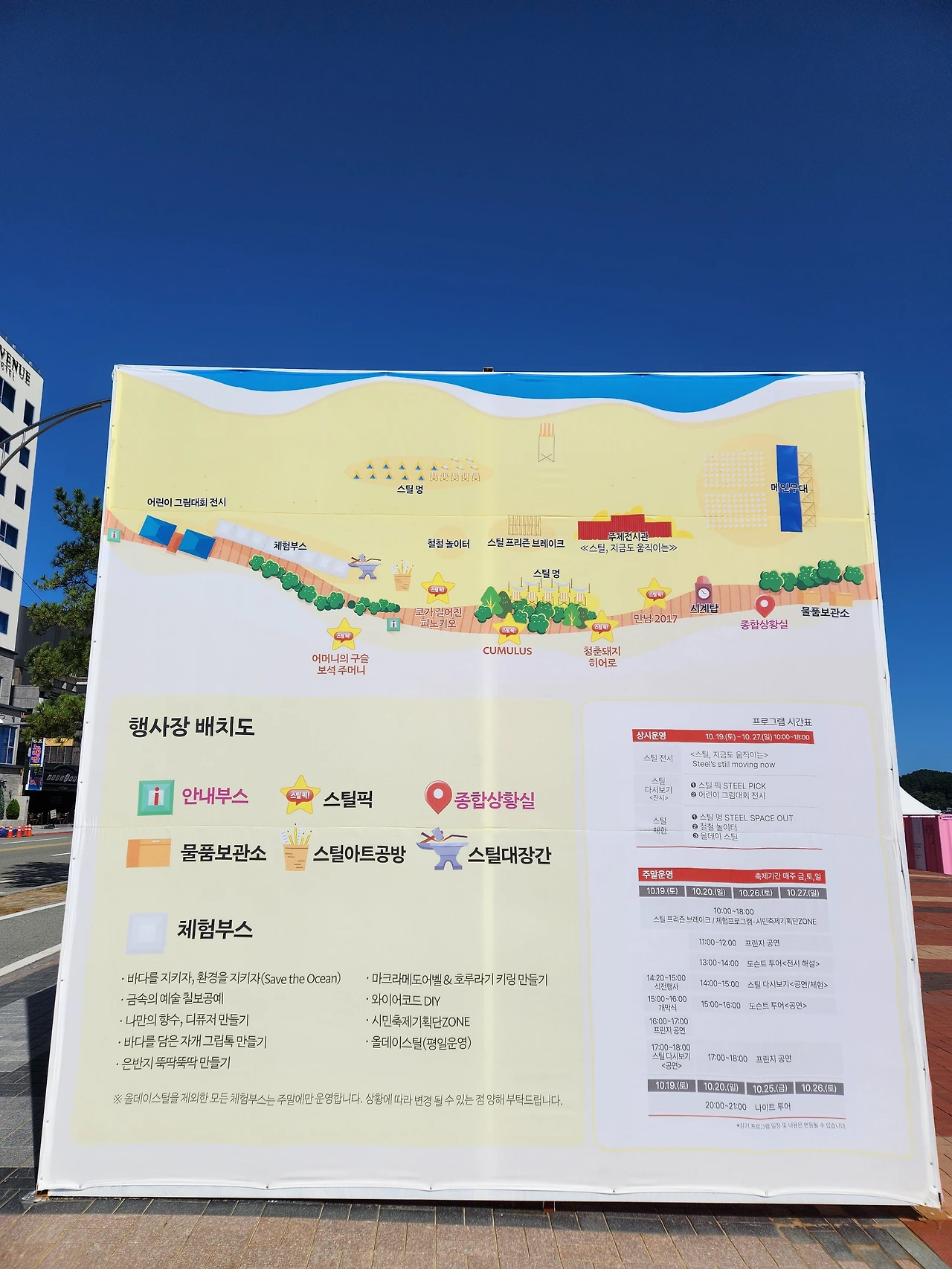 행사 참여를 유인(誘引)하는 다양한 체험부스와 시설물이 해안길을 따라 여기저기 설치되어 있었지만 거리를 오가는 사람들은 별다른 관심을 보이지 않았다. 다섯 곳의 지정된 부스를 방문해서 스탬프를 모두 찍은 후 엽서를 기념손수건과 키링으로 교환하는 사람들이 있긴 했으나, 아직은 이른 아침이고 또 평일이어선지는 몰라도 여느 때보다 거리가 한산한 편이었다. 다만, 날이 다시 개이면서 주말까지 화창한 가을날씨가 이어지면 스페이스워크를 찾아오는 관광객들과 함께 시민들의 발걸음도 끊이지 않을 거란 생각이 들었다.