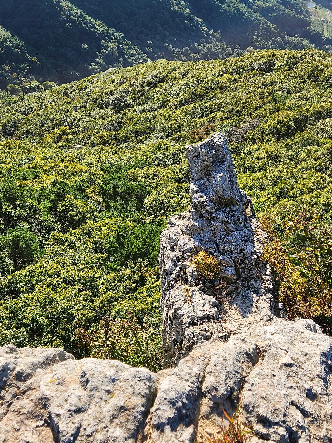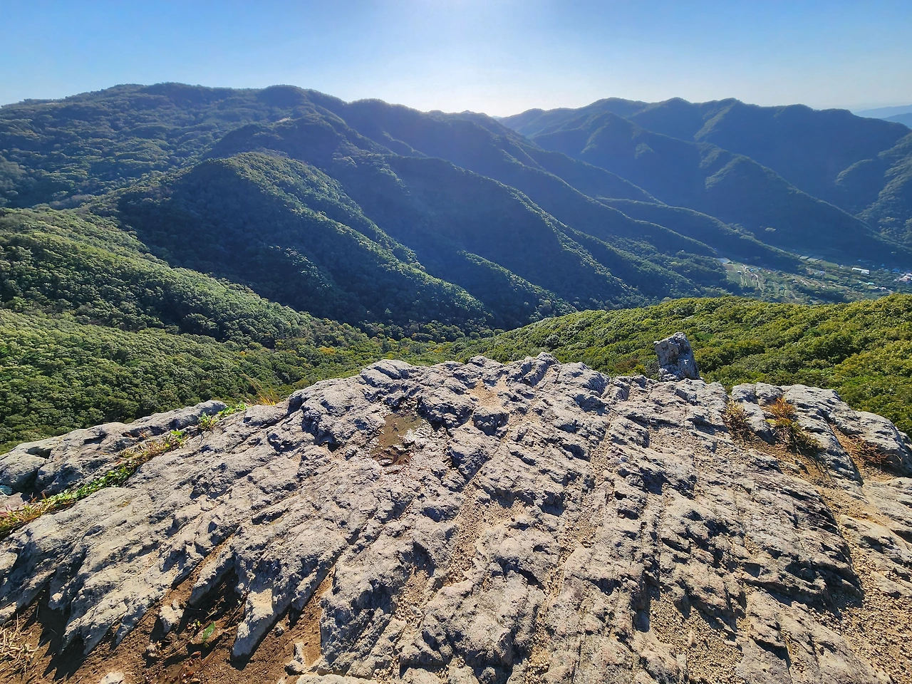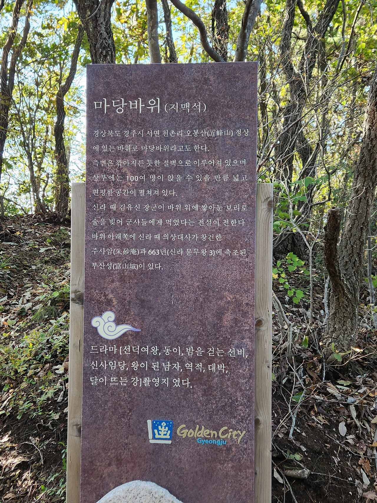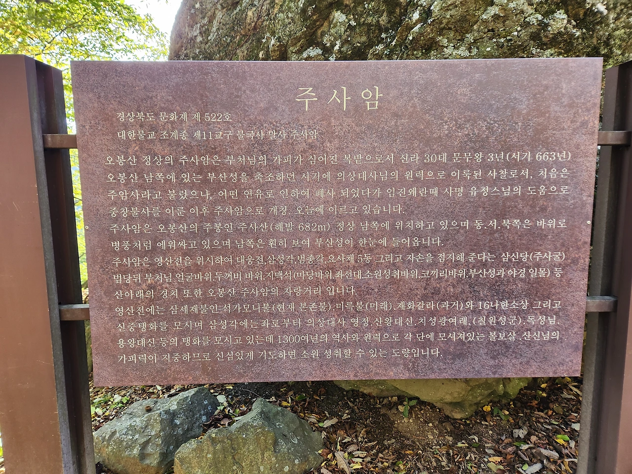 과연 오봉산 정상에 있는 주사암에 오르니, 남쪽 방향으로 겹겹으로 둘러 쌓인 산의 능선을 따라 부산성이 이어져 있는 것이 한눈에 보였다. 주사암은, 영산전과 대웅전을 비롯한 전각(殿閣)과 법당 뒤 사물(事物)의 형상을 닮은 바위도 볼만했지만, 김유신 장군이 바위 위에 쌓아 둔 보리로 술을 빚어 병사들에게 먹였다는 마당바위(지맥석)에서 산아래로 내려다 보이는 경치가 특히 절경(絶景)이었다. 주사굴을 돌아서 오봉산 정상에 오르니, 오봉산의 표지석(標識石)의 측면에는 '산에 남기는 것은 발자욱, 가져가는 것은 추억뿐!'이란 글귀가 새겨져 있어, 먼 훗날 오늘을 추억할 때 지금의 심정을 미리 일러놓은 것 같아 특히 인상 깊었다.