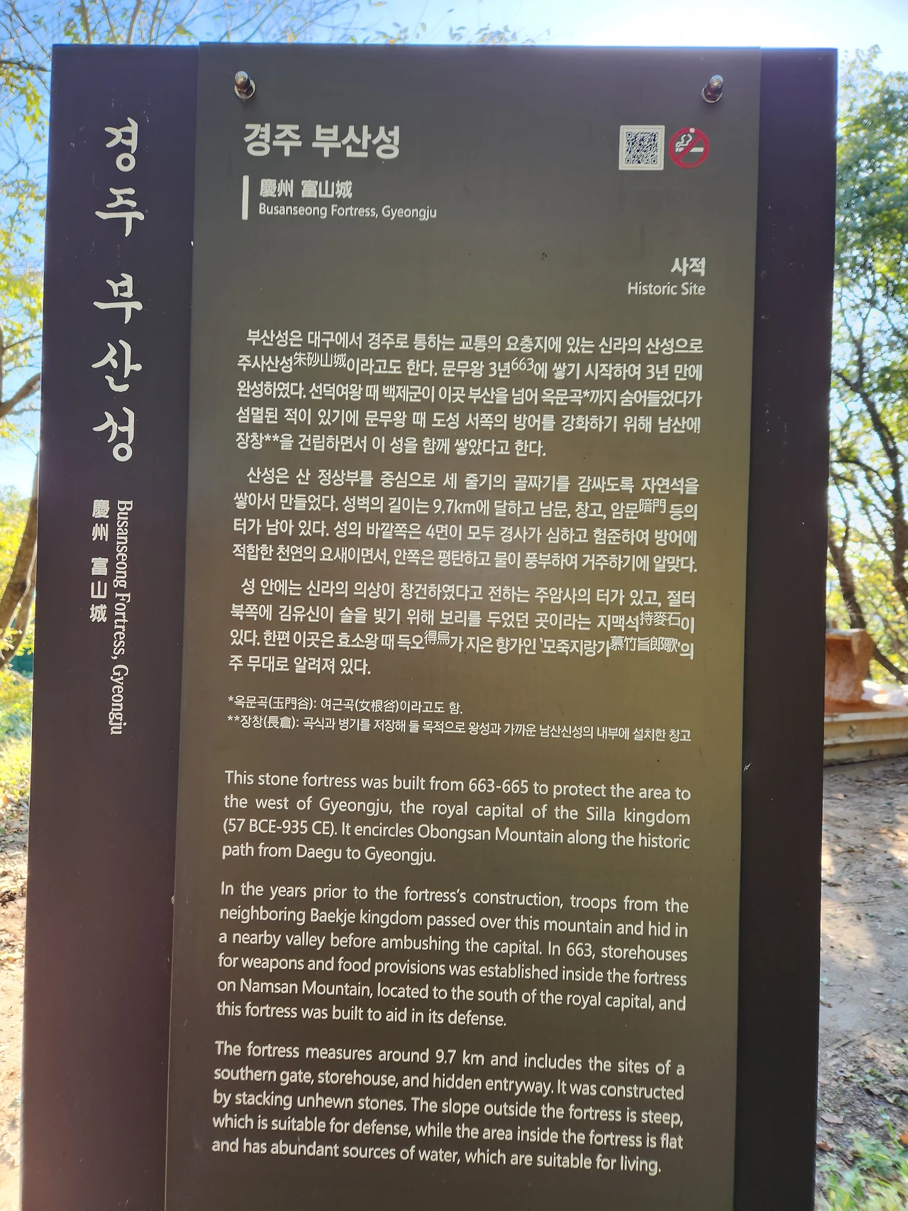 이다음으로 들린 행선지는 경주 '부산성(副山城)'과 '주사암(朱沙庵)'이었다. 그런데, 부산성을 한눈에 담기 위해서는 마을 아래로부터 오봉산(五峰山) 정상에 있는 주사암까지 올라가야 하는데, 오솔길의 폭이 겨우 차 한 대가 지나갈 수 있는 경사가 심한 비탈길이고 한쪽은 낭떠러지어서 산길을 굽이굽이 돌아 오르는 내내 가슴을 쓸어내려야 했다. 부산성은, 지난날 달구벌(대구)에서 서라벌(경주)로 통하는 교통의 요지에 있는 신라시대의 산성으로, 백제군으로부터 도성(都城)을 방어하기 위해 돌로 쌓은 산성이라고 한다. 부산성은 또한, 신라의 화랑도인 '죽지랑(竹旨郞)'이 백제군과의 전투에서 죽은 것을 추모하기 위해 '득오(得烏)'란 사람이 지은 향가(鄕歌) '모죽지랑가(慕竹旨郞歌)'의 주무대로 알려져 있다. 이 산성을 울타리로 하여, 오봉산의 정상에는 경상북도 문화제 제522호인 주사암이 자리 잡고 있는데 부처님의 가피(加被)가 심어진 복밭으로서, 부산성을 축조(築造)하던 시기에 의상 대사의 원력(願力)으로 지어진 사찰(주암사)이라고 전해진다. 이후 임진왜란 때 사명당 유정 대사의 도움으로 중창불사(重創佛事)를 이룬 이후 주사암으로 개칭(改稱)을 하여 오늘날에 이르고 있다.