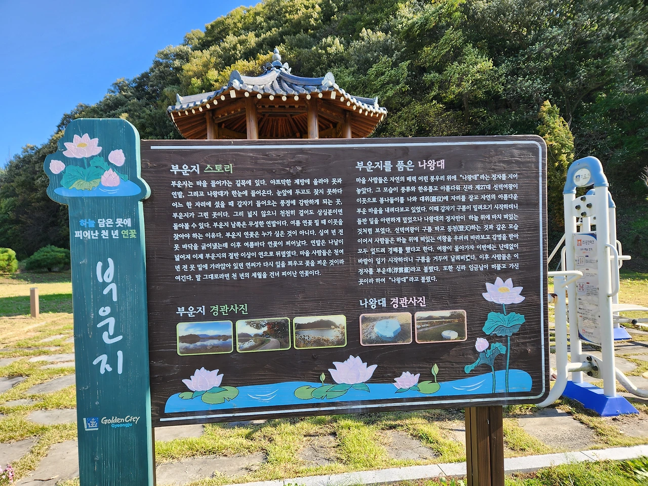 이 실장과 함께 가장 먼저 들린 곳은 신라 제27대 왕인 선덕여왕의 행적(行跡)이 닿아 있는 '부운지(浮雲池)'였다. '하늘 담은 못에 피어난 천 년 연꽃'으로 못의 절반이상이 뒤덮인 부운지. 십수 년 전 못 바닥을 긁어내다가 못 아래 가라앉아 있던 천 년 전의 연 씨를 발견했는데, 그 연 씨가 발아(發芽)하여 다시 잎을 틔우고 천 년의 세월을 건너 피어난 연꽃으로 뒤덮여 있는 못이 바로 부운지인 것이다. 그리고, 이 부운지를 발아래로 두고 있는 봉우리에 '나왕대(羅王臺)'가 있다. 나왕대는, 달리 '부운대(浮雲臺)'라고도 불리는데, 선덕여왕이 봄나들이를 왔다가 대(臺) 위에 앉아 풍광(風光)이 아름다운 마을을 굽어보았다는 전설이 서려있는, 돌을 깎아서 만든 좌대(座臺)이다.