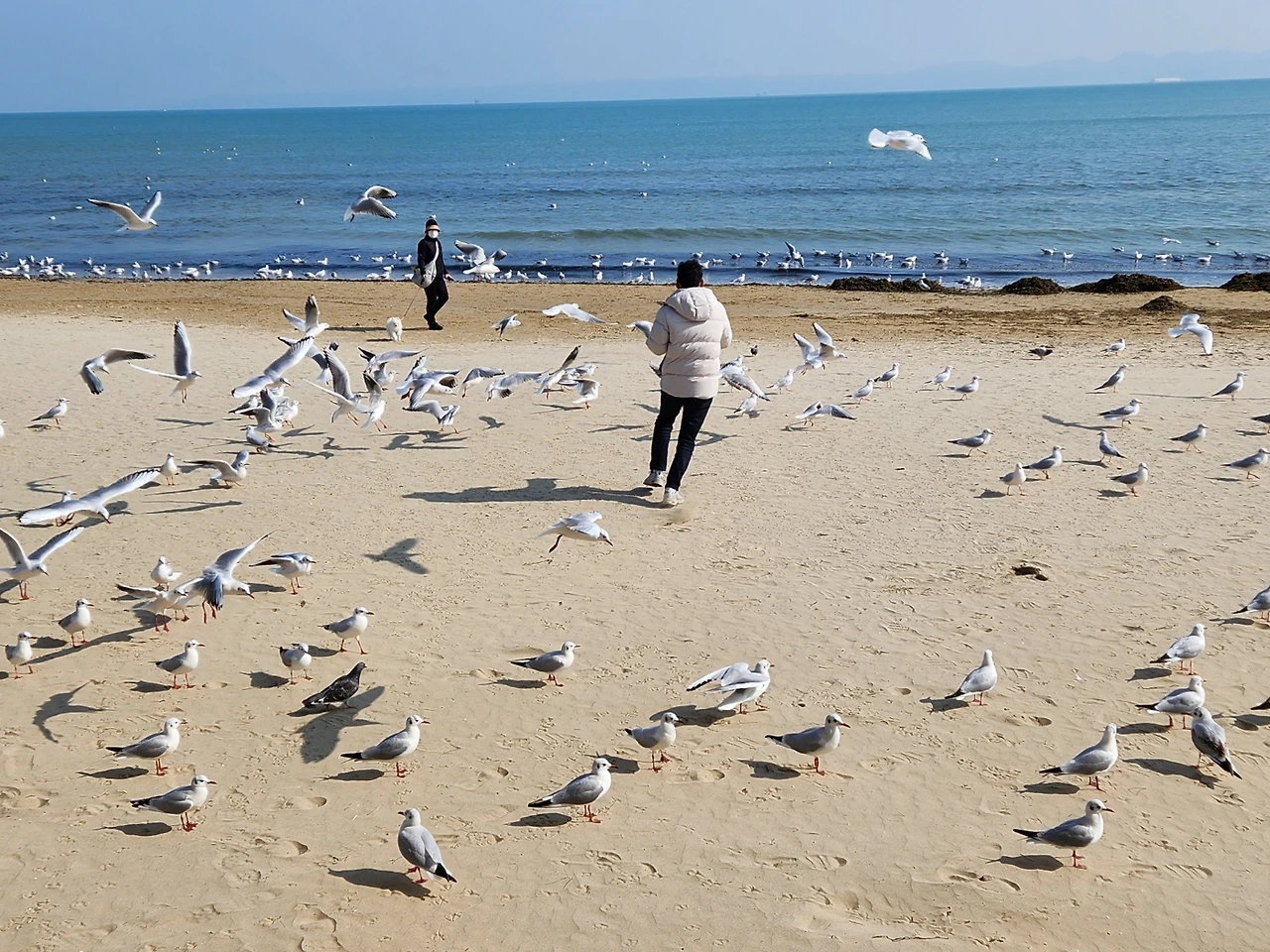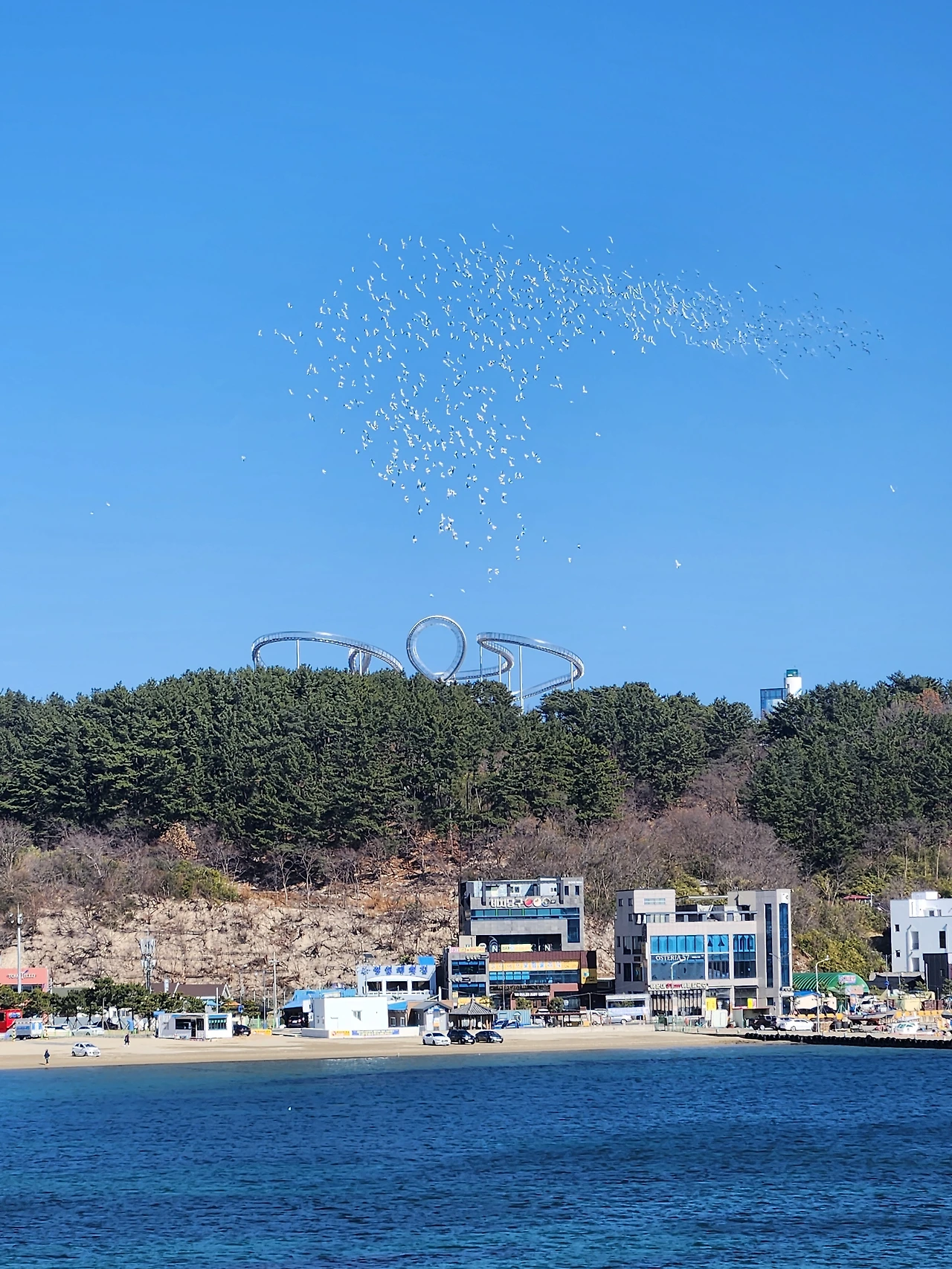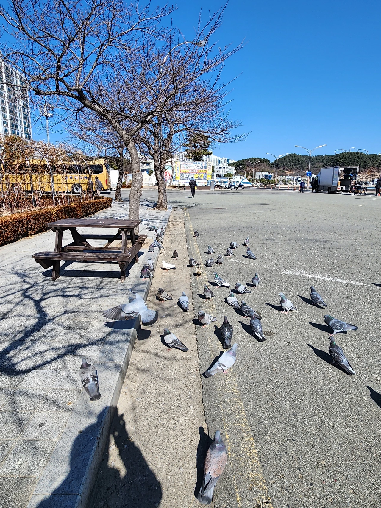 오늘처럼 영일대 바닷가에서는, 비둘기와 갈매기가 사람들 가까이서 뒤섞일 때가 있다. 이럴 때 이 둘은, 마치 종(種)이 다른 한 개체(個體)처럼 보이기도 한다. 이른바, 어느 쪽에서 보든 비둘매기가 되는 것이다. 단, 이들이 터를 잡는 경계는 서로 분명해 보인다. 즉, 도로 가까운 보도(步道) 블록 위를 분주하게 나돌아 다니다 기분 내키면 바닷가 모래사장 위로도 거침없이 내딛는 쪽은 비둘기이다. 갈매기는 주로 얕은 바다 위를 자맥질하며 유유자적(悠悠自適)하다가, 젖은 날개깃이라도 말릴 때면 어김없이 널따란 백사장이나 데트라포트에서 제자리를 잡는다.