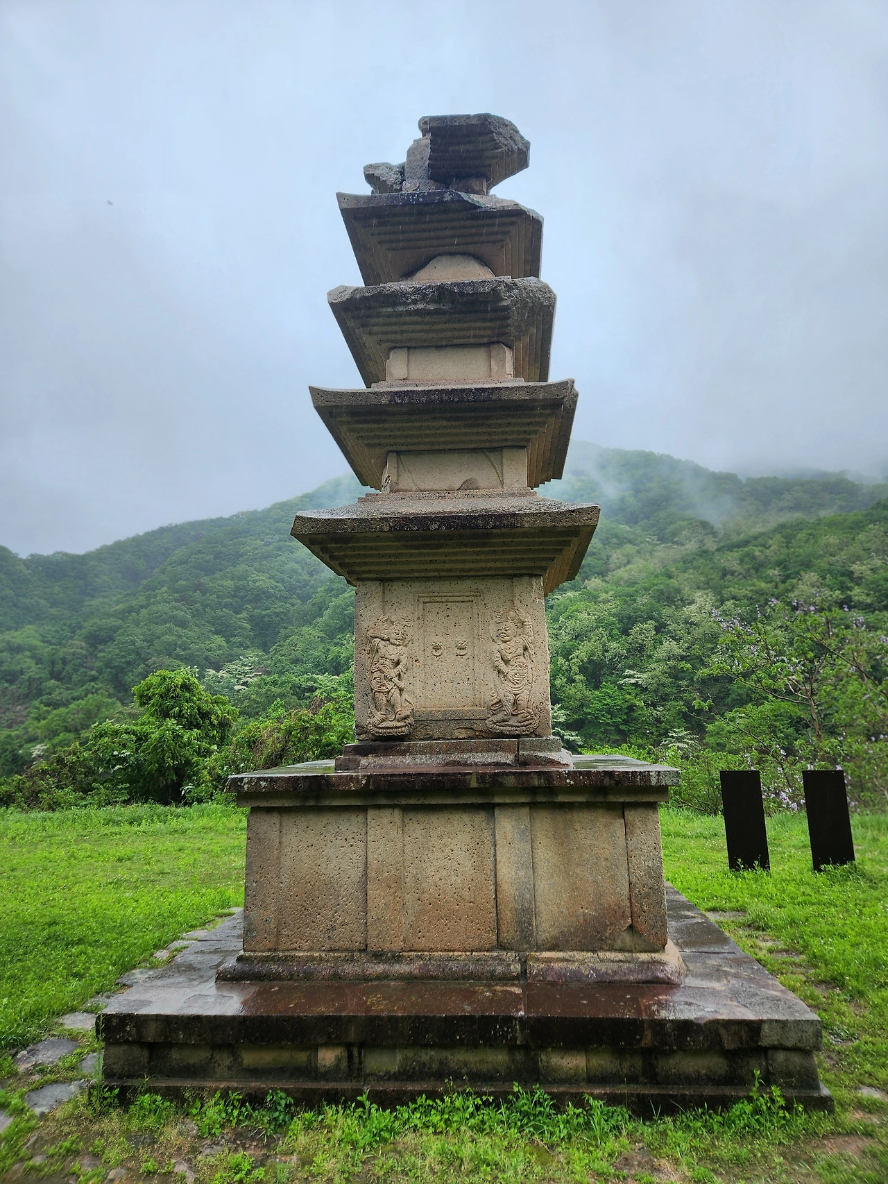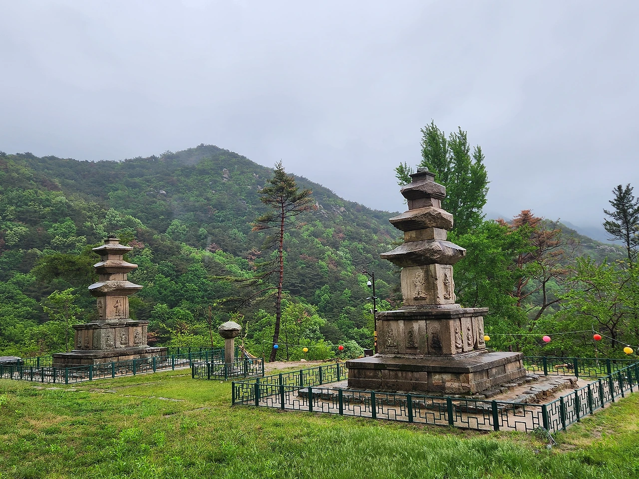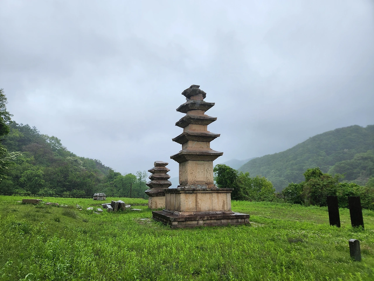 장항리 사지에 비를 맞고 나란히 서 있는 동탑과 서탑