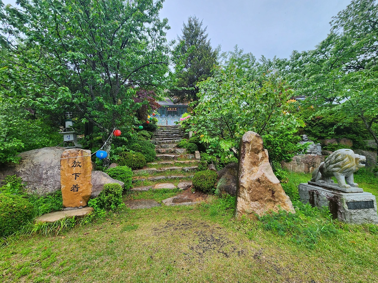 빗물이 고인 절간의 마당에 서니 원원사의 대웅전 격인 천불보전으로 오르는 돌계단이 있고, 그 왼쪽으로 방하착(放下着)'이라는 세 글자를 음각으로 선명하게 새겨놓은 표지석이 서 있다. 방하착은 '손을 내려 밑에 둔다'는 뜻인데, 흔히 내려놓아라, 놓아 버려라라는 의미로 불교의 선종에서 화두로 삼고 있는 말이다. 마침, 산문으로 들어서는 순간부터 더욱 거세진 비바람에 정신줄마저 놓을 지경이었으니, 계단을 오르기도 전에 마음 한 곳을 비우기는 했나 보다. 무엇보다도, 인적이 끊어진 산사의 고즈넉함이 마음에 들었다. 전각의 구성이 천불보전과 종각, 그리고 단출하게 요사채 등으로 이루어져 있어, 우선 보기에도 소담스러운 것이 탐욕과는 거리가 멀어 보였다. 마침, 비바람을 피해 절간으로 숨어든 길냥이 한 마리가 멀뚱한 눈으로 방하착 표지석을 훑어보며 돌계단을 오르고 있었는데, 집착을 버린 산중의 고승처럼 이 빗속을 요량도 없이 유유자적이었다.