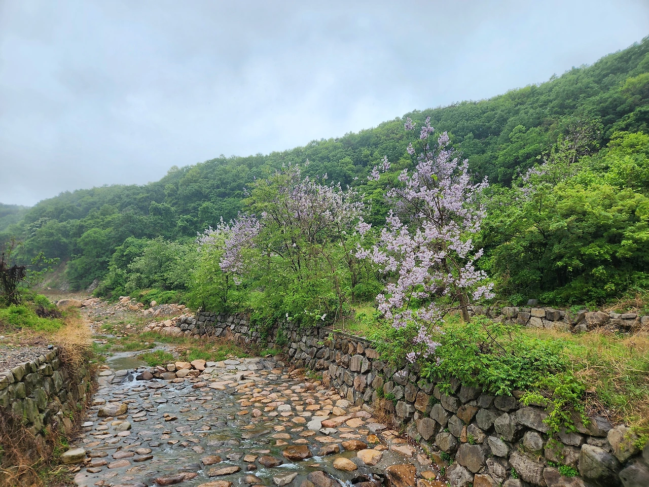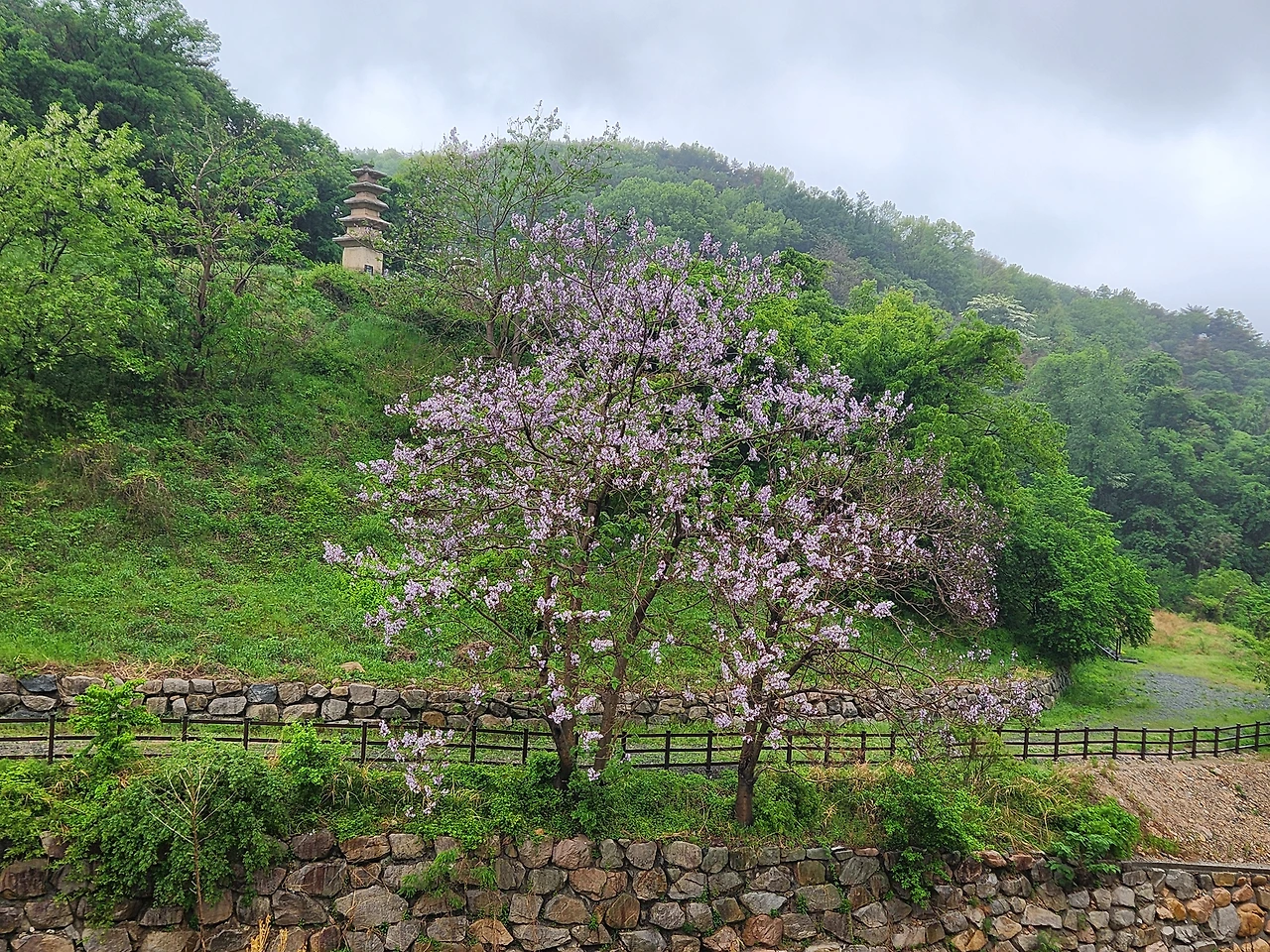 유적 제45인 장항리 사지(寺址)를 들리기 전에 토함산 아래 순두부 식당에서 늦은 점심을 먹었다. 경주 장항리 석탑이 서 있는 폐사지(廢寺址)에 관해서는 아무런 기록이 남아있지 않아, 지금은 절터가 자리 잡은 구역의 이름을 따서 장항리 사지라고 부르고 있다. 이 외딴 절터에는 국보 제236호로 지정되어 있는 서 오 층 석탑과 동탑, 석조불대좌 등의 유구(遺構)가 남아 있는데, 비바람이 약간 잦아들긴 했어도, 멀리 보이는 장항리 사지 쪽으로 넘어가기 위해서는 계곡을 따라 내려오는 개울물을 건너야 했다. 그런데 날씨가 조금 을씨년스럽기는 하나, 목조다리가 놓인 천변(川邊)을 따라 심어놓은 오동나무의 연보랏빛 꽃이 만개(滿開)하여 비 오는 봄날의 정취를 더해주고 있었다.