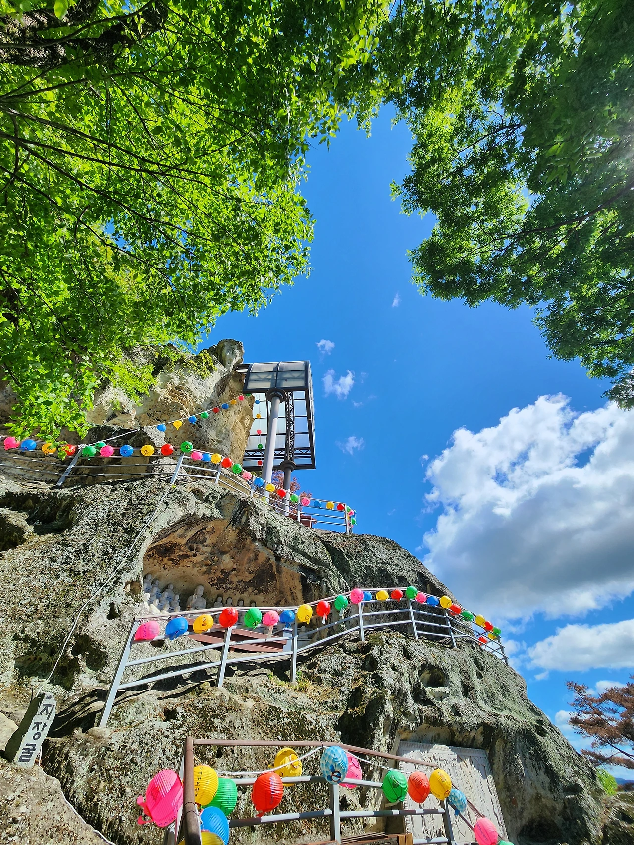 제단 아래의 동자승과 산아래에서 본 마애여래좌상