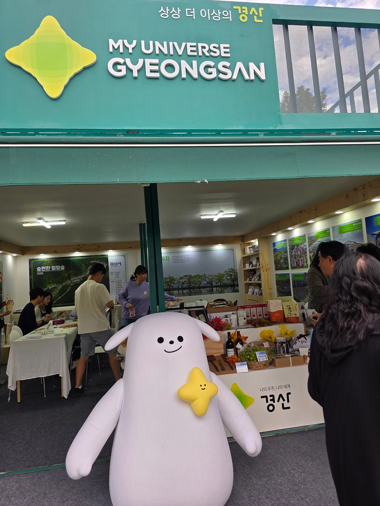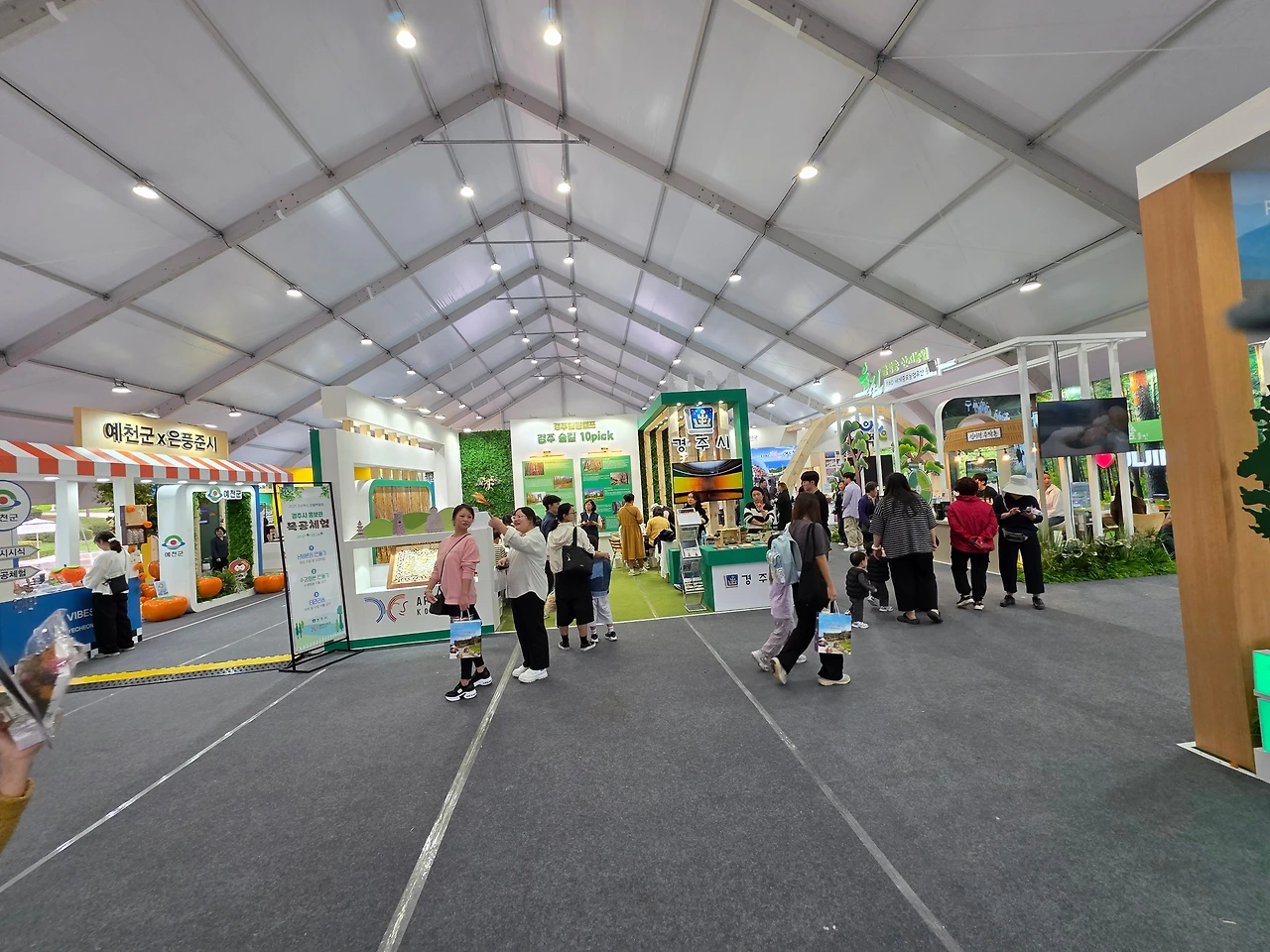 둘째 날은 전날 미리 눈에 담아두었던 순서대로 풍기군 부스부터 먼저 들렀다. 이곳은 선착순으로 원판 돌리기를 해서 경품을 추첨했는데, 내 뒤로 다섯 사람이 더 줄을 서자마자 바로 마감이 되었다. 앞에 서 먼저 추첨한 사람들 중에는 네댓 명에 한 사람 꼴로 꽝도 나왔는데, 선물 중 가장 큰 경품은 풍기인삼이었다. 앞 선 사람들을 통틀어서 겨우 서너 사람만 풍기인삼에 당첨되었는데, 열명 가까운 사람들이 꽝을 포함해서 번갈아가며 그렇고 그런 경품에 당첨된 후 마지막으로 남은 귀중한 행운 하나가 마침내 나에게로 이르렀다. 주변에서 박수와 함께 부러움 섞인 환호와 시선이 쏟아져서 약간은 부담스러웠다. 이다음 발걸음을 돌려 찾은 곳은 청도군 부스였는데, 이곳에서는 연필꽂이 같은 생활소품을 만드는 목공체험을 운영 중이었다. 유약으로 마무리 한 연필꽂이 완성품과 함께 청도 특산물인 반시 한 박스를 답례품으로 주었는데 전혀 생각지도 못한 선물이었다. 그 밖에, 김천시 부스에서는 호두를 한 손아귀에다 10개 이상 움켜 잡는 사람에게 경품을 주는 재미난 행사를 했고, 구미나 칠곡을 비롯한 여러 다른 시군에서도 지역 특산물 홍보와 함께 다양한 체험활동을 운영하여 사람들의 호기심을 이끌어냈다.