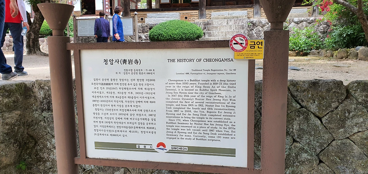 경내에 들어서니 독경 소리가 낭랑하게 들리고, 단아하게 승복을 입은 비구 스님이 불당을 오가며 불자들의 묻는 말에 친절하게 설법하는 모습이 보였다. 뜰안을 붉게 물들이고 있는 찔레꽃이 마치 장미꽃처럼 활짝 피어 벌들을 유혹하고 있는데, 청암사의 전반적인 인상이 여기저기를 잘 가꿔놓은 화단처럼 아름답다는 것이다.