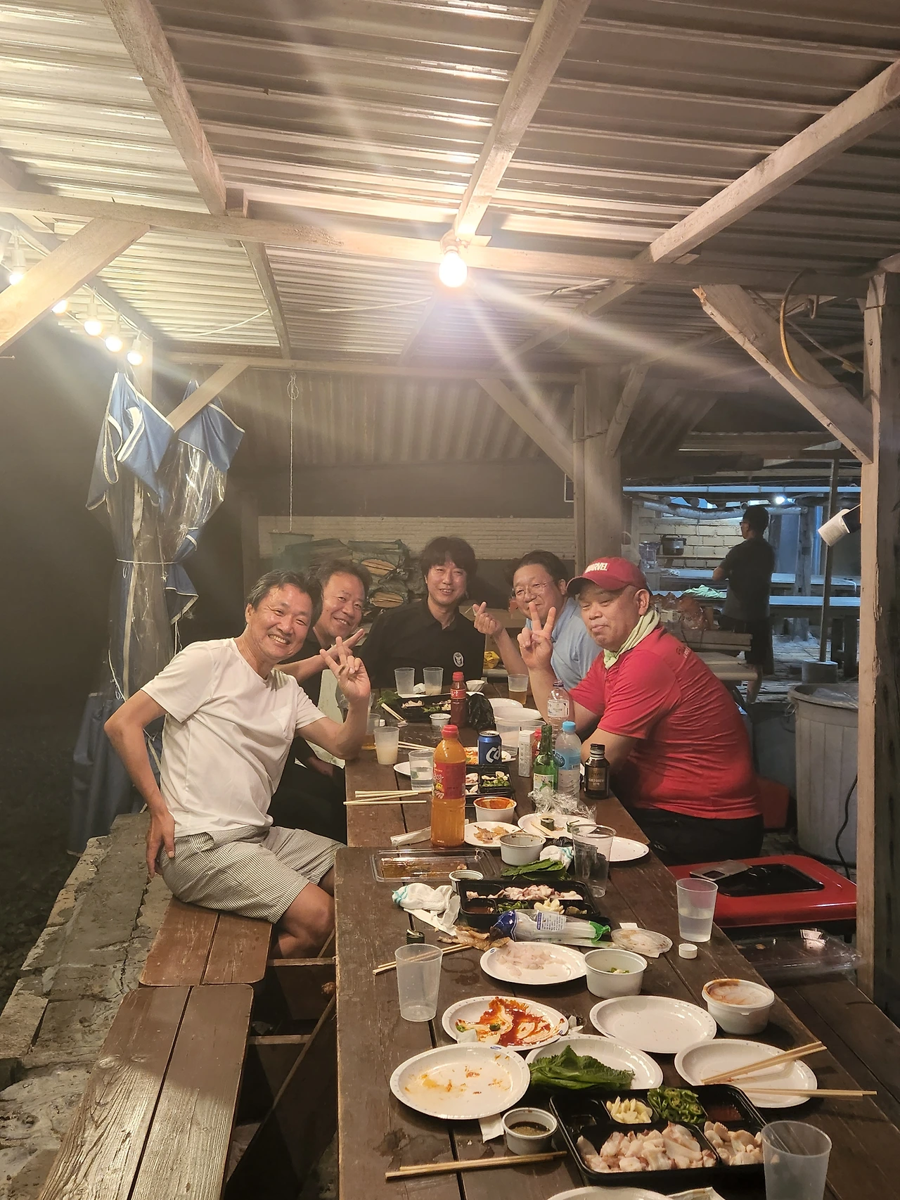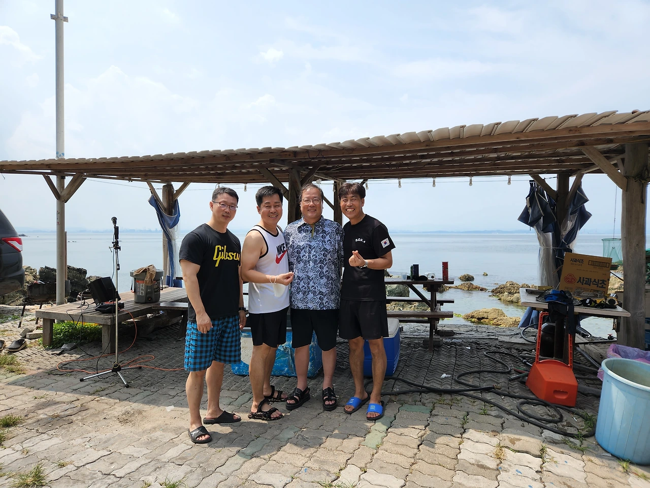 이때부터였지 싶다. 오늘 행사를 대비해서 병준이가 마련한 고출력 스피커를 설치하고, 무대 공연용 마이크와 함께 휴대폰을 이용한 반주기까지 설치하니 여느 바닷가 버스킹 무대 못지않았다. 해병대 출신답게 전투수영을 한 기억을 되살려 물속에 몸부터 담그고 나온 승대와, 오랫동안 바디빌딩으로 몸매를 다져 온 병준 선생님, 펜션 주인장 장해, 초등학교 교감선생님 재윤이, 건설회사 부장님 종억이와 내가 오순도순 햇빛을 피해 테이블을 옮겨가며 술자리를 이어가고 있는데, 초등학교 선생님 영성이와 함께 앞서 말한 순찬이와 용석이, 동기회 사무국장 재현이가 잇달아 도착을 해서 술자리에 합류(合流)했다. 문어를 내어와서는 순찬이가 따로 준비해 온 가자미를 즉석에서 튀기고, 참소라와 가리비찜, 전복을 버터로 구워 안주로 함께 내어 놓으니 술안주로 이 이상 가는 별미는 없었다.