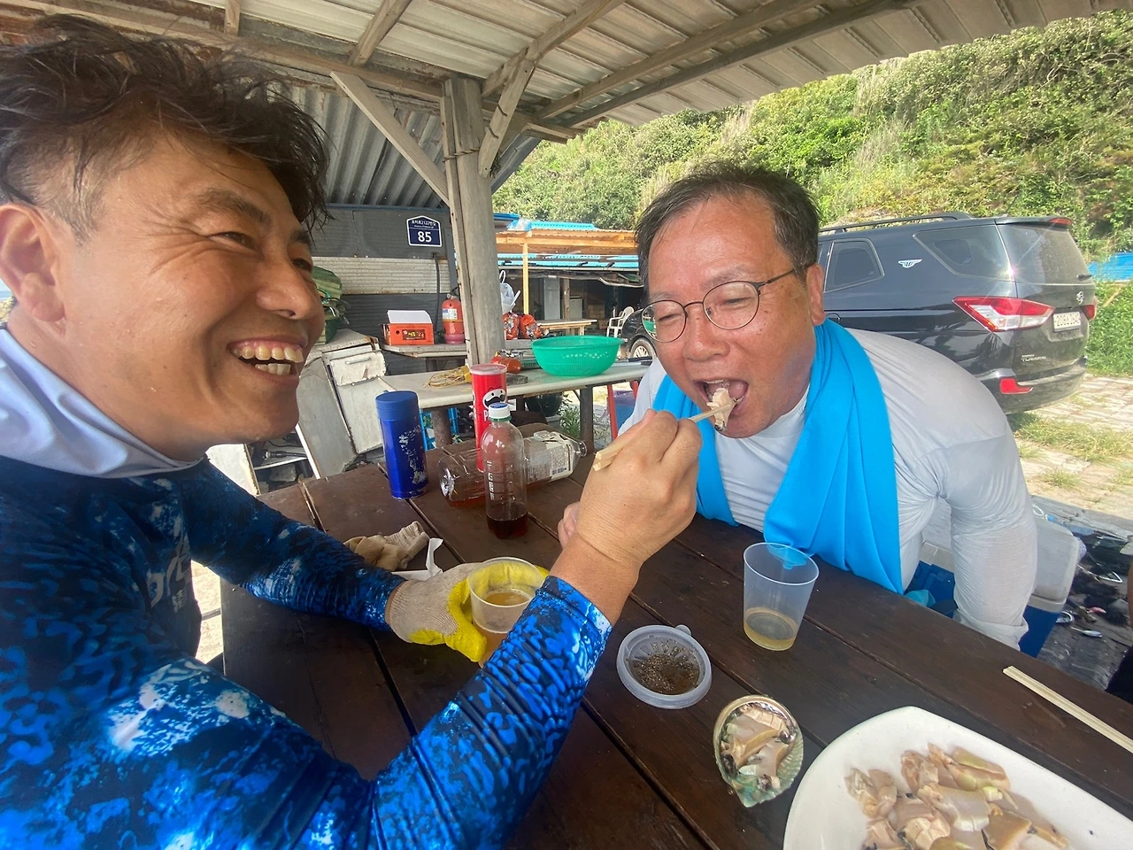 장해는 벌써 친구들을 맞이할 준비를 끝내 두고 있었다. 우선 오는 순서대로 반갑게 인사를 나누기로 하고, 잠깐 숙소에다 짐 정리를 하고 난 뒤 마당가 식탁에 자리를 폈다. 며칠 사이 물속에서 고생해서 잡은 전복을 성둥성둥 잘라, 얼음 속에 잘 재어 둔 맥주로 시원하게 입가심하며 맛을 보는데, 양식 전복 크기에 못지않은 자연산에다 이런 자리가 아니면 맛볼 수 없는 귀물(貴物)이어서 그런지 맛이 각별했다. 우리들끼리 한 순배(巡杯)를 돌리자마자 바로 뒤를 이어 마당으로 들어선 차에서 종억이가 내린다.