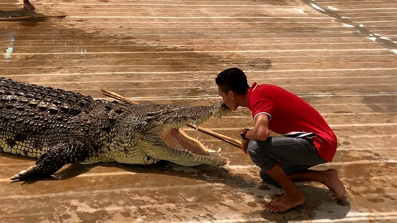 한 조 한 조련사가 악어 등 위에 올라타더니 이내 악어 등 위에 누워버리고 손을 흔들어 주었다. 이쯤에서 관중들의 큰 박수와 환호가 쏟아져야 하는데 관광객들이 우리 포함 9명이었나? 분위기가 썰렁했다. 썰렁한 반응과 달리 조련사는 다시 진지한 모습으로 악어 입에 손을 넣고 뽀뽀를 하며 15분 정도 펼친 악어쇼가 마무리되었다. 기다린 시간에 비하면 상당히 짧은 쇼 타임이었지만 악어를 직접 만지고 코앞에서 볼 수 있다는 것에 위안을 삼았다.