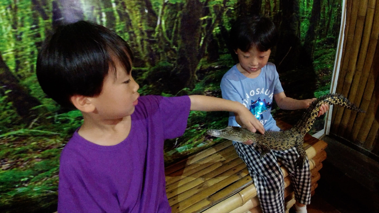어느 순간 하민이는 가이드분과 두 손 꼭 잡고 다니기 시작했다. 엄마 닮아서 그런지 어딜 가니 친화력 하나는 엄지 척이다. 그렇게 두 손잡고 다니다 어느 건물로 들어갔다. 그곳에 공연을 하는 장소로 보였다. 그때 가이드가 구석에서 이곳으로 오라고 손짓을 했다. 우리는 그곳으로 향했고 그곳엔 새끼 악어 한 마리가 있었다. 물론 입은 테이핑 되어 있었고 그 악어를 만져보라고 권했다. 아무도 만지지 못하던 그 악어를 역시 호기심 대장 하민이는 거침없이 만지며 들어보았다. 의외로 묵직했고 가죽은 단단했다. 짧은 시간이었지만 악어를 직접 만져봤다는 사실에 아이들은 뿌듯해했다.