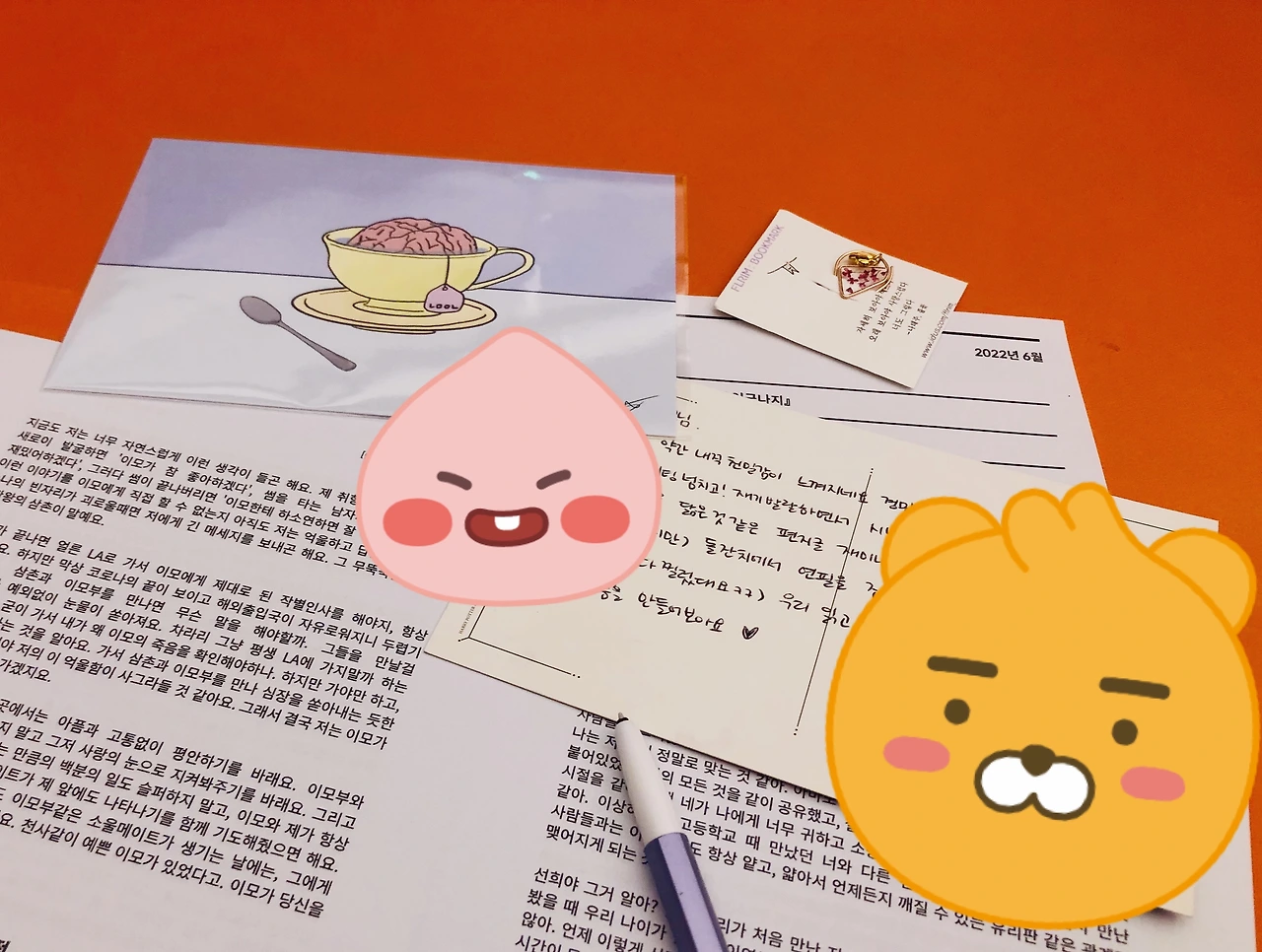 새롭게 신청한 클럽은 첫 모임부터 범상치 않다. 정성스레 쓴 손 편지를 받고, 멤버마다 의미를 담은 책갈피를 선물을 준비해 주셨다. 그뿐일까? 왼손으로 직접 그린 엽서를 보면서 손재주에 감탄하고 다른 한 손에 쥐어진 랜디스 도넛을 집어 냠냠 먹으면서 멤버들의 따뜻함을 흠뻑 만끽한다. 오랫동안 이 클럽을 한 고인물이 많아 텃세가 있을까 살짝 우려도 했지만 훈훈한 분위기에서 그동안 멤버들과 파트너가 같이 일궈나간 노력으로 다져진 끈끈한 의리를 엿본다. 이 클럽이 빨리 마감돼서 아쉬운 마음에 찜해두고 빈자리가 날 때까지 대기 탄 나 칭찬해. 애정이 넘치는 클럽과 모임에 진심인 멤버를 보면 설레고 친해지고 싶다. 그런 모임에서 이야기를 자유롭게 나누면 긴장을 놓지 않고 집중하느라 빡세지만 아지트를 벗어나면 새롭게 태어난 듯 개운하다. 한 책으로 여러 시선을 나누고 지성이 뿜뿜한 토론을 하고 나면 하루를 알차게 보냈다고 느낀다.