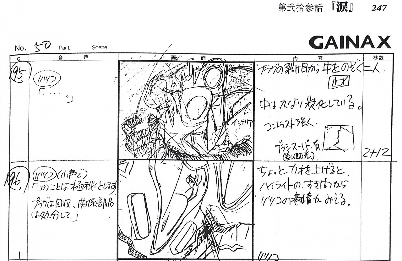 제가 알기로 이 장면은 리쓰코가 조사원들에게 레이의 죽음을 은폐하는 모습으로 해석되는 것이 일반적입니다. 레이의 더미가 존재한다는 사실 자체가 극비이기 때문입니다. 그런데 키타무라의 해석을 읽어보니 그럴 듯하게 느껴지기도 하네요. 엔트리 플러그 안에 있던 것이 나오코의 모습이었다면, 리쓰코가 "도망치듯이 자리를" 뜨고도 남겠다는 생각이 듭니다. 영호기가 자폭한 순간, 레이의 죽음은 확정적이니 조사원이 놀라거나 리쓰코가 극비로 부치는 것도 어딘가 자연스럽지 않구요. 실제로 이 장면 이후에 리쓰코는 완전히 다른 사람이 되어 레이의 더미를 파괴합니다. 영호기의 잔해에서 발견된 것이 평범한(?) 레이의 사체였다면, 그후 리쓰코가 보여준 행동이 잘 이해가 안 가긴 합니다.