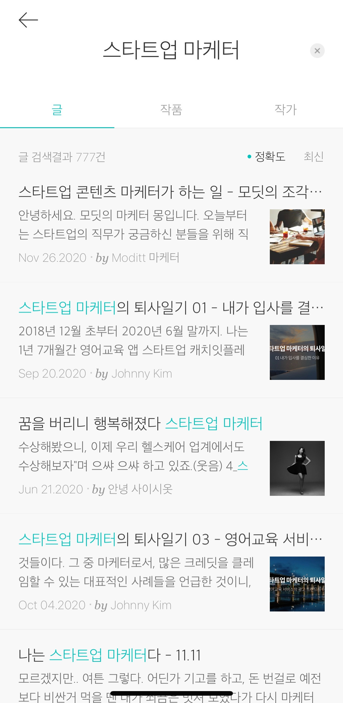 이 두 꼭지를 가지고, 가장 잘 나가는 브런치에 검색을 한 결과는 아래와 같다. 요즘 잘 나가는 글(?!)의 특징인 문장형이 많다. 그리고 변함없는 픽업 잘되는 제목의 특성인 ‘-하는 방법 7가지’, ‘-라면 알아야 하는 필수 용어’ 등의 정보 제공형 제목이 눈에 띈다. 정보 제공형 제목은 필자도 회사 콘텐츠를 발행할 때 많이 사용하는 기법(?!)이긴 하나 세련됨을 많이 상실할 수 있다는 단점이 있다. 반면, 문장형 제목은 세련됨을 줄 수는 있으나 자칫 잘못 시도하면 원하는 정보도 제공하지 못하고, 픽업도 되지 않는 그저 그런 형태의 제목이 될 수도 있다.