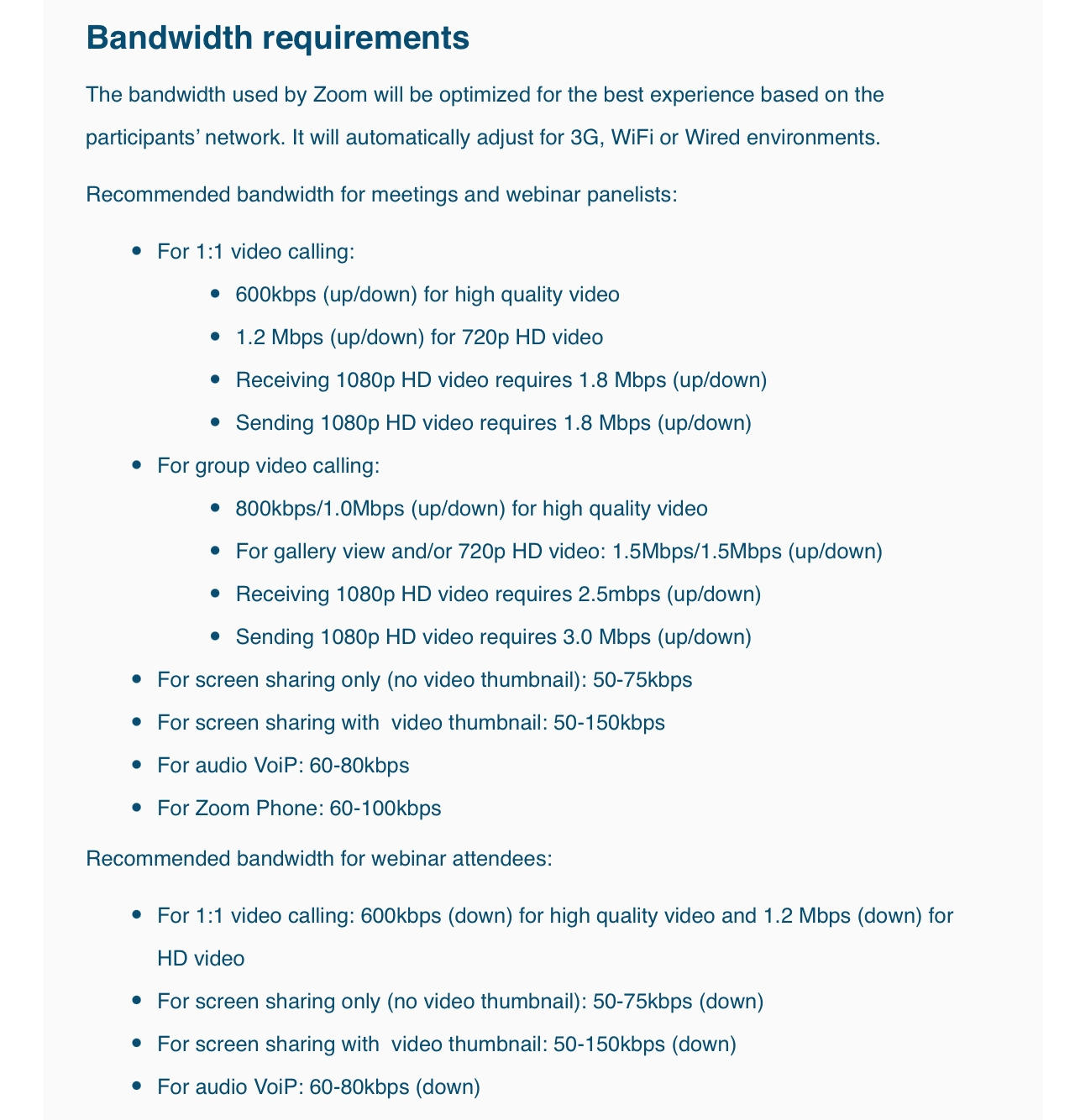 영상 회의가 시작되고 화면 인코딩을 시작하면 발열이 심해지고 팬이 열심히 돌아가기 시작할 것이다. 유튜브를 볼 때와는 비교가 안될 정도로 컴퓨터가 일을 많이 해야 하기 때문이다. 네트워크도 유튜브를 볼 때와 다르게 다른 화면을 다운로드도 받아야 하고, 내 화면을 보내야 해서 업로드도 해야 한다. 줌 문서상으로는 720p HD 영상을 보내는데 1.5 Mbps가 필요하고, 다운로드하는데도 1.5 Mbps가 필요하다. 유튜브를 볼 때보다는 숫자가 작다고 안심하면 안 된다. 왜냐하면 통신사들이 인터넷 업로드 속도를 제한하는 경우가 종종 있기 때문이다.