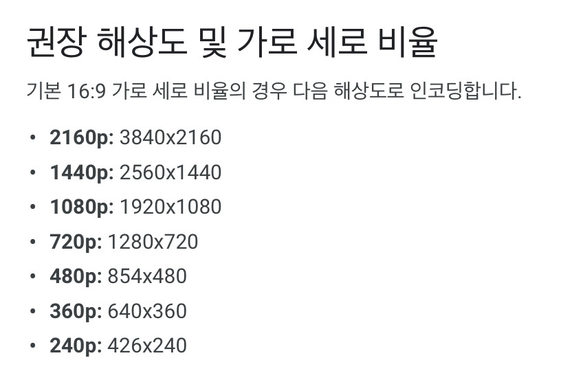 아래 화면은 유튜브 고객센터에 있는 화면 크기별 네트워크 권장 속도다.