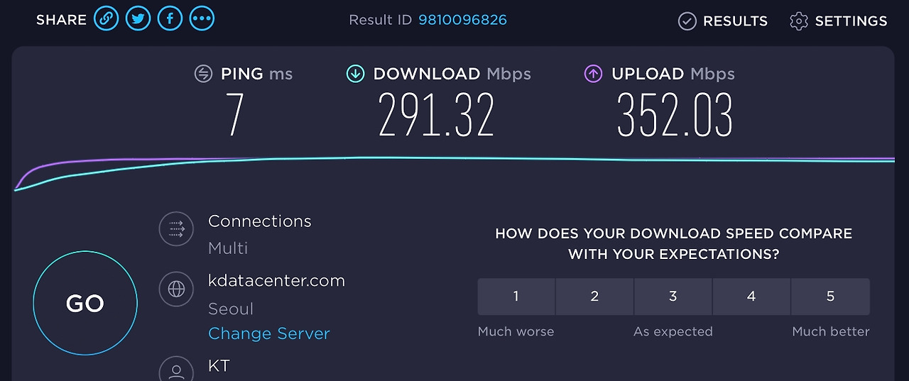 아래 화면은 5 GHz 대역으로 K사 기가 인터넷 망에서 무선으로 속도 테스트를 한 결과다. 다운로드로 다른 장비에서 쓰고 있다 보니 오히려 업로드가 더 높게 나온 것처럼 보인다. 특히 인터넷 TV를 보는 집에서는 다운로드 속도가 확연하게 차이가 나기도 한다.