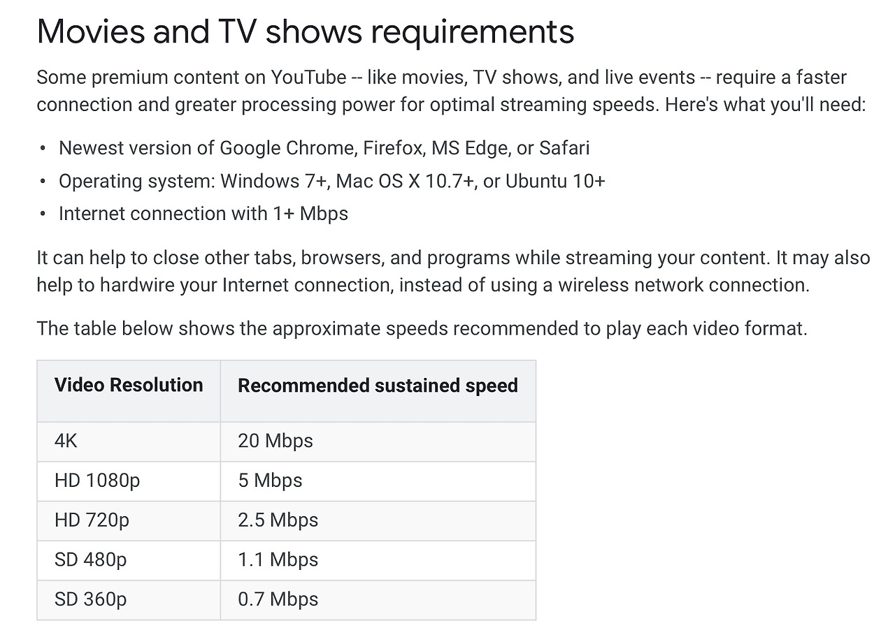 집에서 사용하는 인터넷 상품이 보급형 100 Mbps이고 무선랜 장비도 별도로 빠른 걸로 구입한 게 아니라 통신 업체에서 나눠준 것을 그대로 사용한다면 50 Mbps가 안정적으로 나오기 어려울 때도 있다. 인터넷 상품에서 얘기하는 기준 속도가 최고 속도일 뿐이고 실제로를 그렇지 않기 때문이다. 하지만 보급형 상품으로 혼자서 유튜브 영상을 보는 용도로 사용한다면 고화질 4K 영상도 무리 없이 볼 수 있다. 아래 기준표에 의하면 4K 영상도 20 Mbps면 충분하기 때문이다.