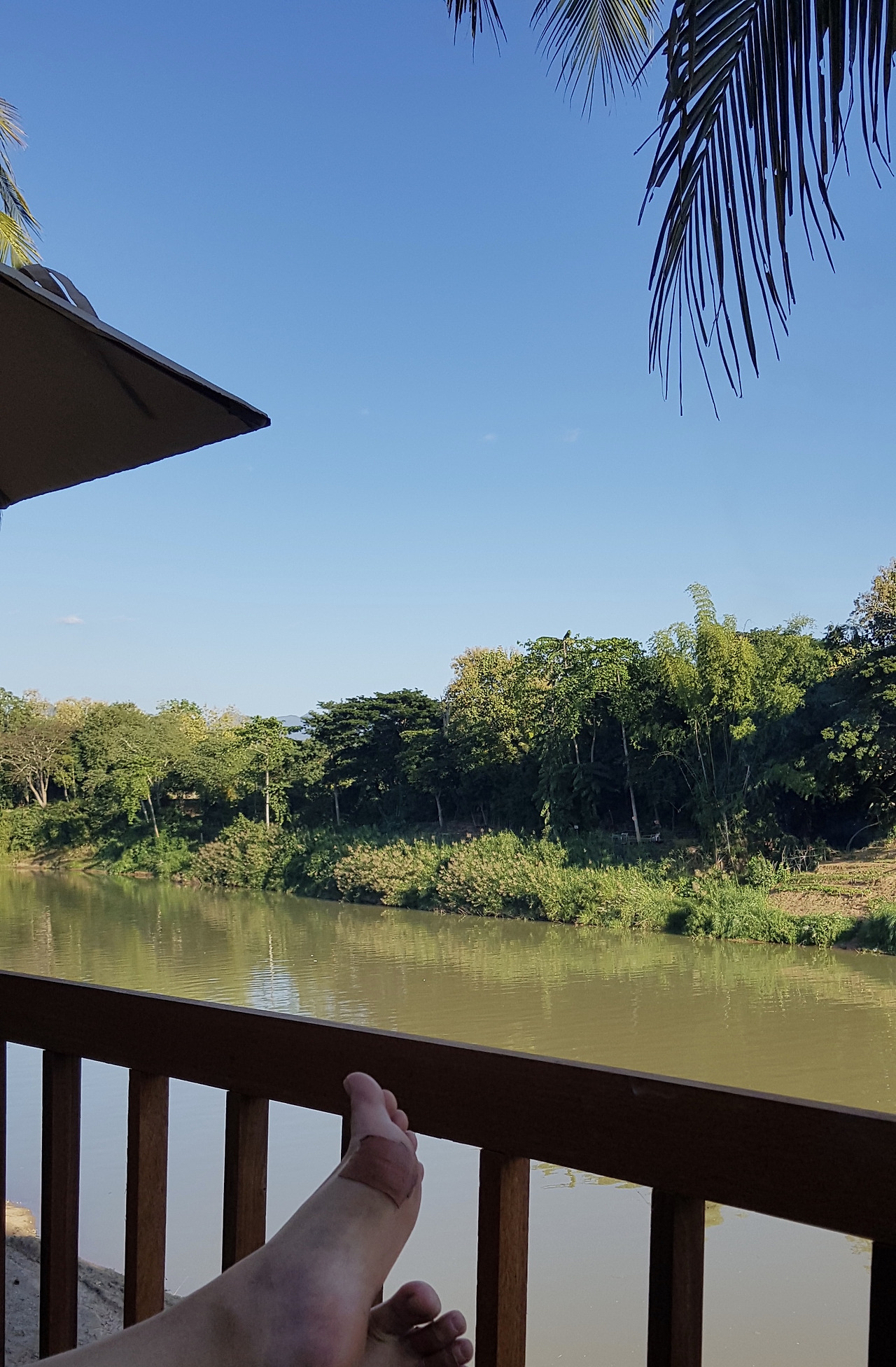 남칸강변은 현지인들의 삶이 있는 메콩강 쪽과는 또 다른 분위기다. 고급 스파와 식당들이 쭈욱 들어서 있는데, 깔끔하고 조용한 분위기다. 우리는 뱀부 브릿지를 건너서 강 너머에 있는 레스토랑에 갈 예정이었지만, 날씨가 너무 덥기도 하고, 그리 급할 거 없다는 생각에 강가의 펍에 앉아 맥주 한 잔 마시기로 했다.