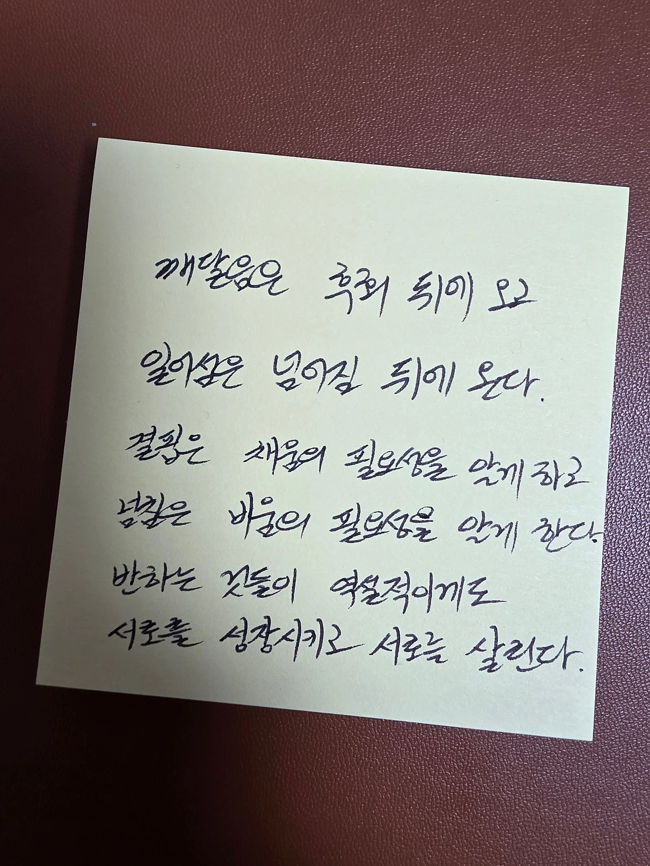 깨달음은 후회 뒤에 오고일어섬은 넘어짐 뒤에 온다.결핍은 채움의 필요성을 알게 하고넘침은 비움의 필요성을 알게 한다.반하는 것들이 역설적이게도서로를 성장시키고 서로를 살린다.삶을 채워갈 글 상자 @live_here_n_nowhttps://www.instagram.com/live_here_n_now/