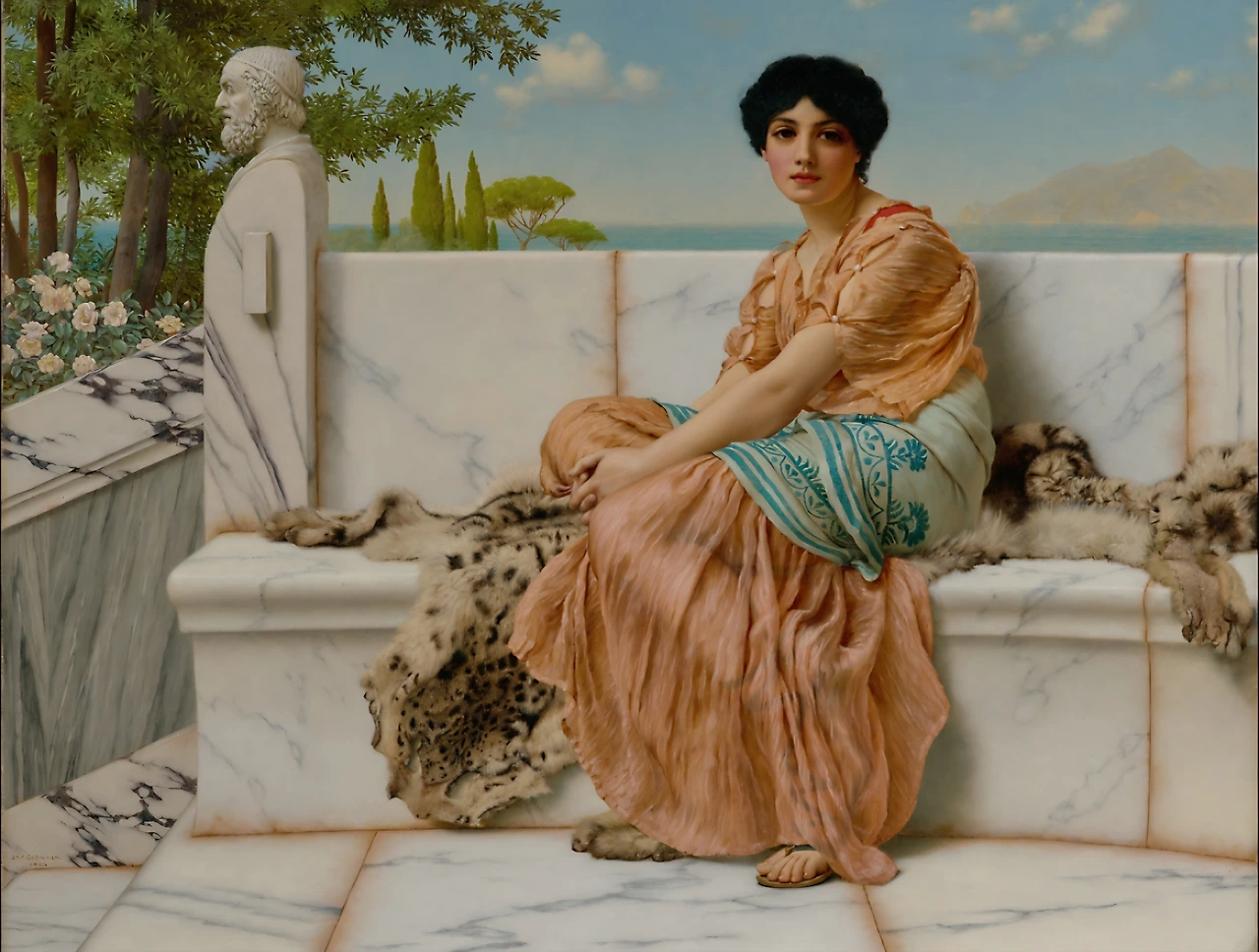 대리석 벤치 위, 한 여인이 앉아 있다.