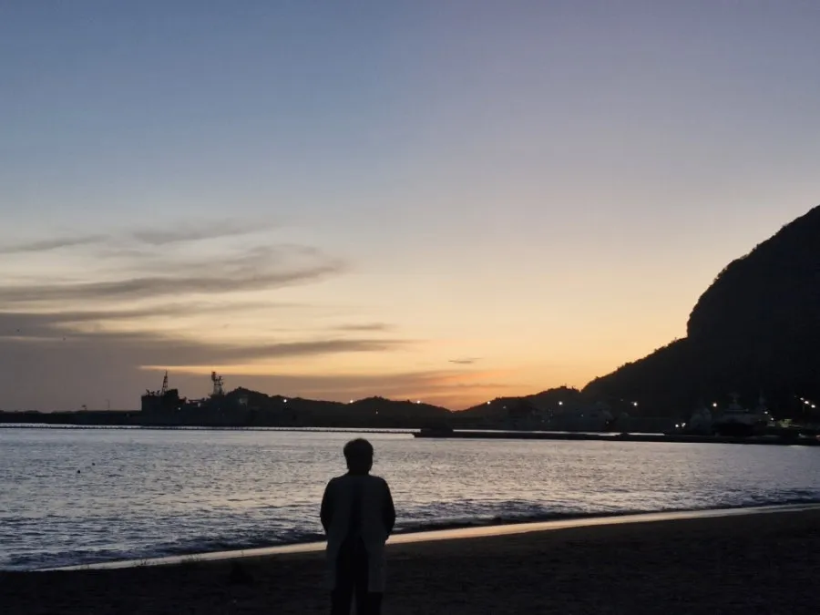 수평선 너머로 지는 석양을 바라보는 장면을 그려본다.