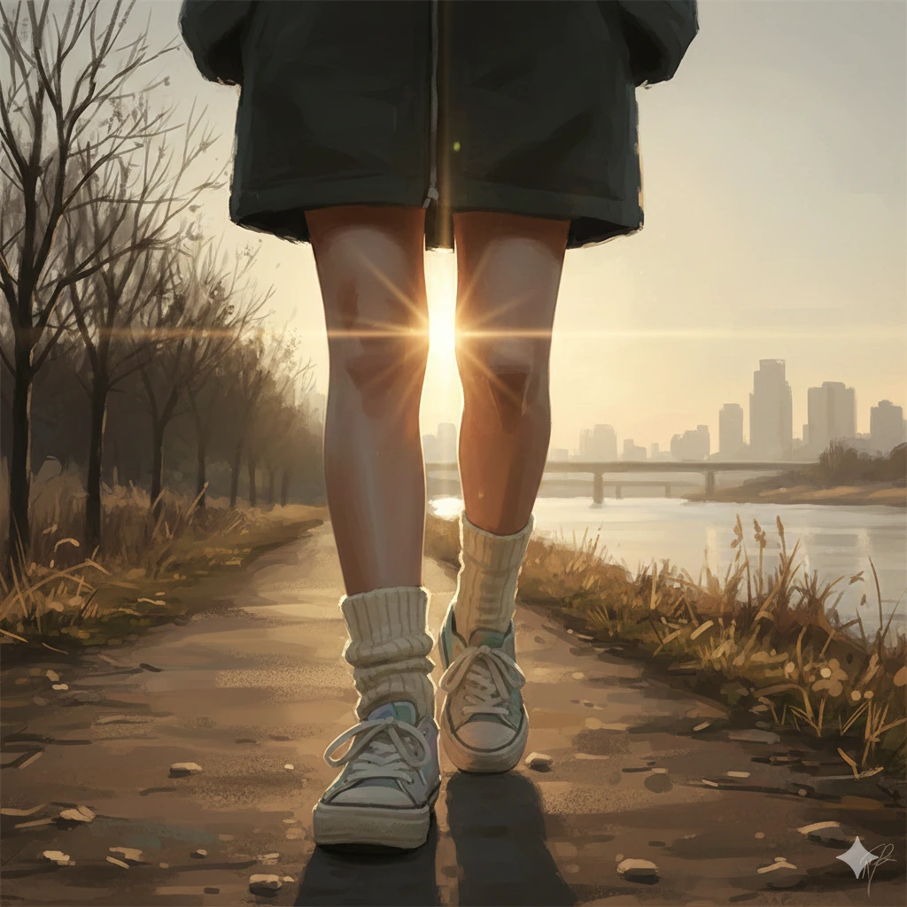 소영 언니네 집에 차를 두었기에 탄천을 따라 걸었다. 예쁜 패션 운동화를 신고 나선 탓에 발등엔 물집이 잡히고 말았다. 17,000보라는 숫자가 무색하게 통증이 밀려왔을 때, 언니가 선뜻 자신의 양말을 벗어 건네주었다. 신발을 벗어 던지고 양말만 신은 채 걷는 길. 발바닥은 여전히 아릿했지만, 그 길을 함께 걸어주는 따뜻한 마음이 고마워 자꾸만 웃음이 났다. 걷는 것 자체가 감사한 하루였다.